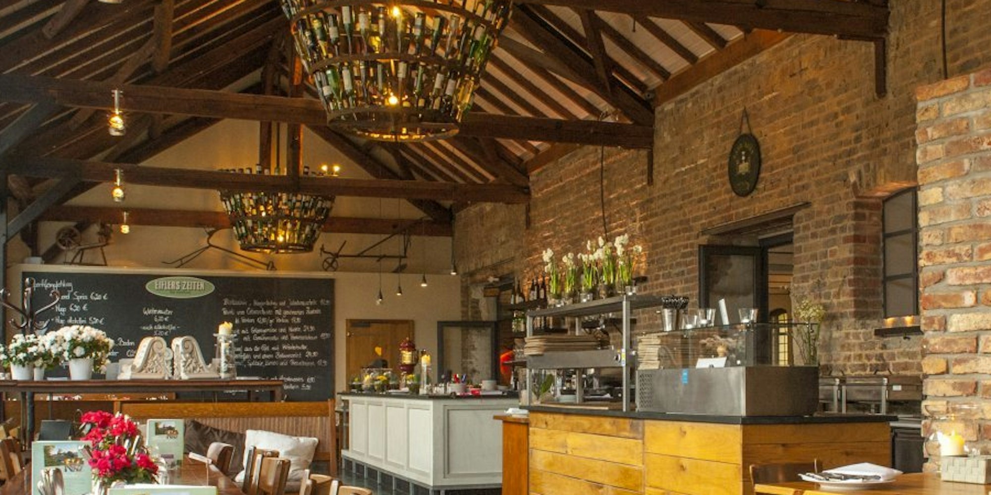 Eine gemütliche Atmosphäre im Saal mit den hölzernen Deckenbalken und den zwei imposanten Flaschenkronleuchtern.