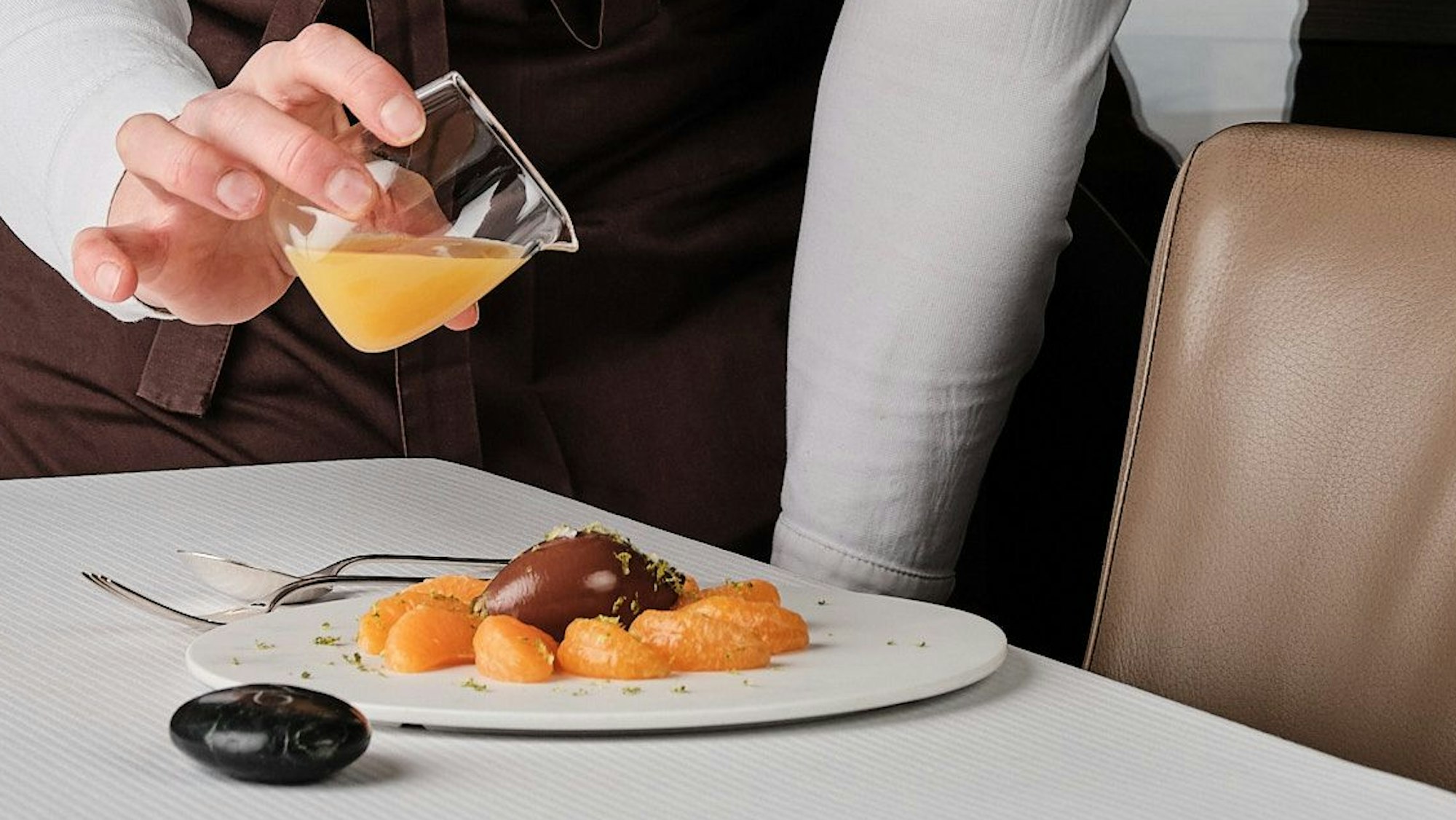 Chef-Patissière Larissa Metz vom Sterne-Restaurant „Vendôme“ am Schloss Bensberg kombiniert Schokoladenaroma mit fruchtiger Säure bei ihrer Baileyscremeux mit Gewürzmandarine.
