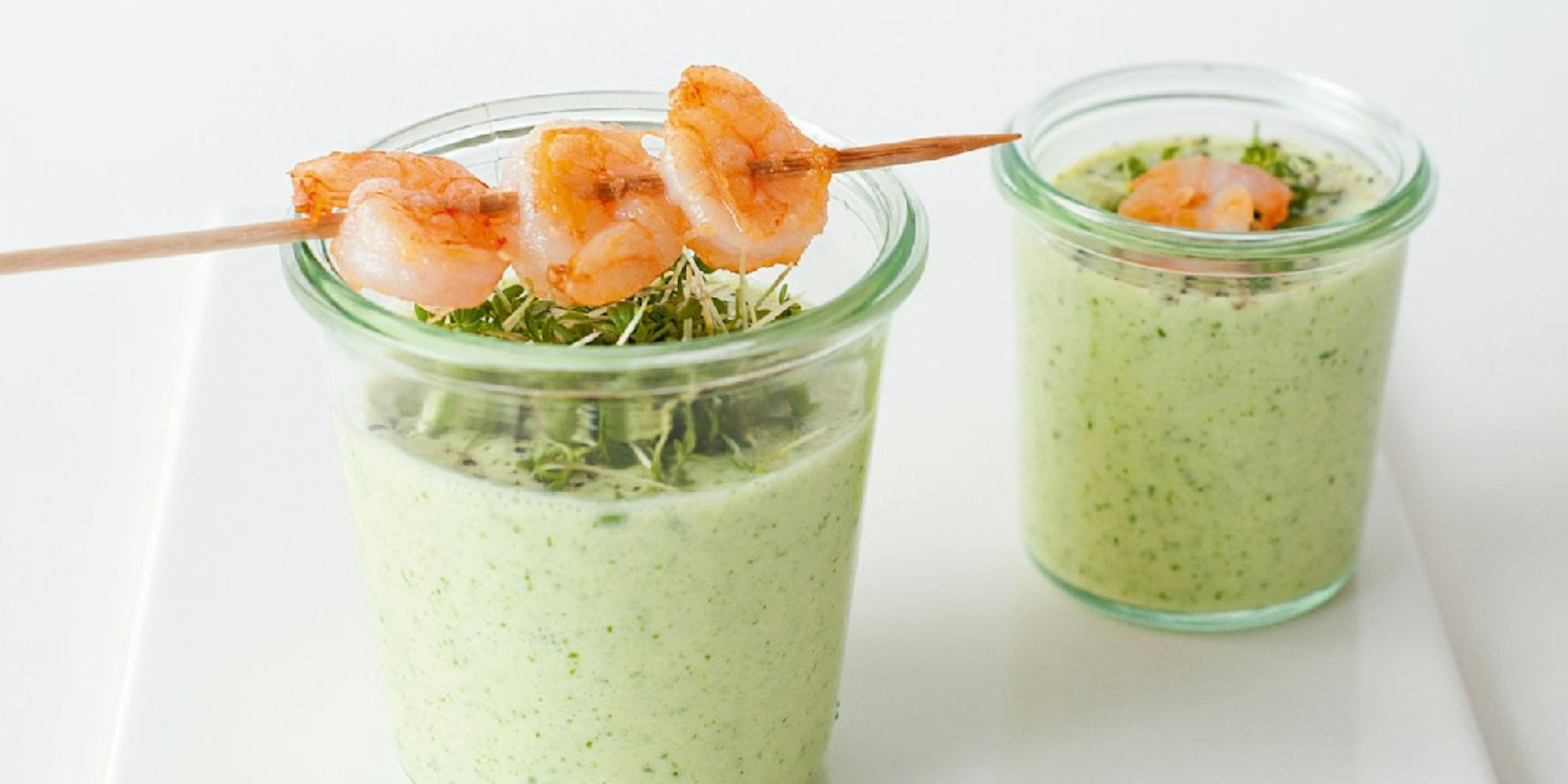 Zubereitung Die Gurke schälen, entkernen und würfeln. Mit Kresse, Petersilie, Fond und saurer Sahne im Mixer zu einer Suppe pürieren. Mit Zitronensaft und Gewürzen abschmecken und kühl stellen. Vor dem Servieren in Gläser oder kleine Schalen füllen und mit Kresse und fein geschnittener Petersilie bestreuen. In einer Pfanne das Öl bei mittlerer Temperatur erhitzen und die Garnelen darin kurz anbraten. Die Suppe mit Petersilie bestreut anrichten, die Garnelen aufspießen und die Spieße dazu servieren. Oder die Garnelen direkt auf die Suppe geben.