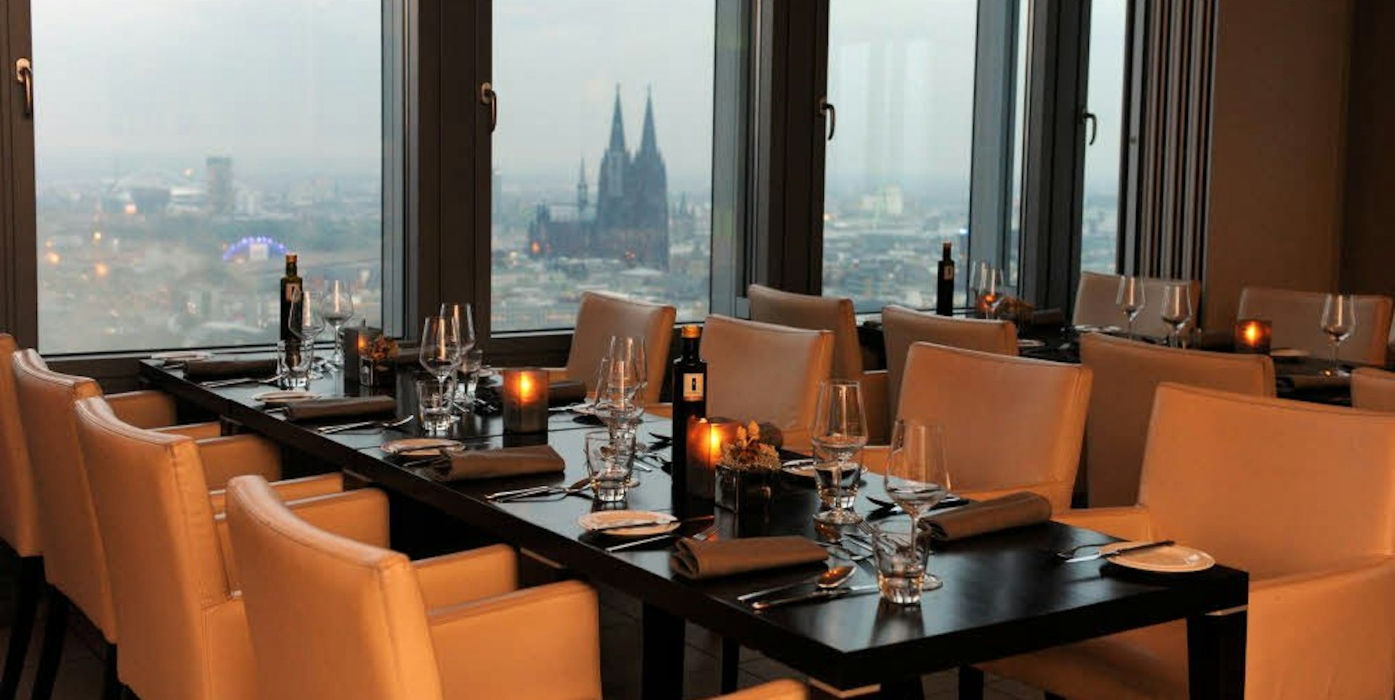 Köln – Man merkt es in der Magengrube, wenn der Aufzug des Kölnturms in die 30. Etage rast. Raketenstart in klein. Oben angekommen ist der Blick fantastisch, selbst bei Nacht. Eine bessere Aussicht beim Essen findet sich in ganz Köln nicht. Das Interieur des Restaurants ist eher dunkel gehalten, die Akustik ist sehr laut – ein kühler Schick, aber die Inneneinrichtung sieht schon ein wenig abgerockt aus.