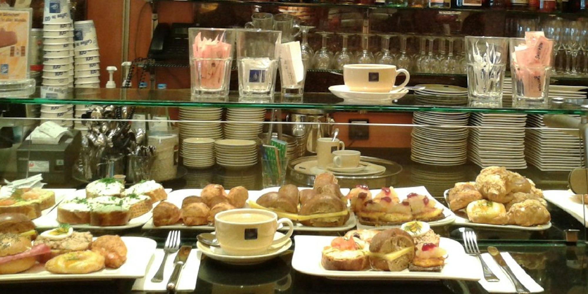 Wir sind auf jeden Fall schon mal mittendrin. Im Zentrum der Shoppingmeile. Unter Sahnetorten, Knuspergebäck, feinsten Pralinen und duftendem Kaffee. Hinter blank geputzten Glasfenstern türmt sich, was zu einer wohlsortierten Konditorei dazugehört. Wir entern einen der ledergepolsterten Hocker an der Kaffeebar und ordern einen Teller voller Häppchen, eine Art kölsche Tapas. Deren Preis ist zwar mit 7,90 Euro für fünf durchaus eine Ansage (4,90 Euro für drei), womöglich aber bloß der City-Zuschlag. Dafür gibt es von belegten Mini-Brötchen, Plunderteilchen und Quiche-Varianten täglich neue Serviervorschläge. Wir stellen fest, dass Reibeküchlein mit Apfelmus und Lachs-Croissant absolut stilvoll den Tag eröffnen. Dort an der lebhaften Kaffeebar, wo der Schampus schon im Frühtau im Eiskübel lagert und die Morgennachrichten am Bildschirm flimmern. (kv)Café Riese, Schildergasse 103, 50667 Köln; Frühstück, Mo – Sa ab 7.30 Uhr www.caferiese.de