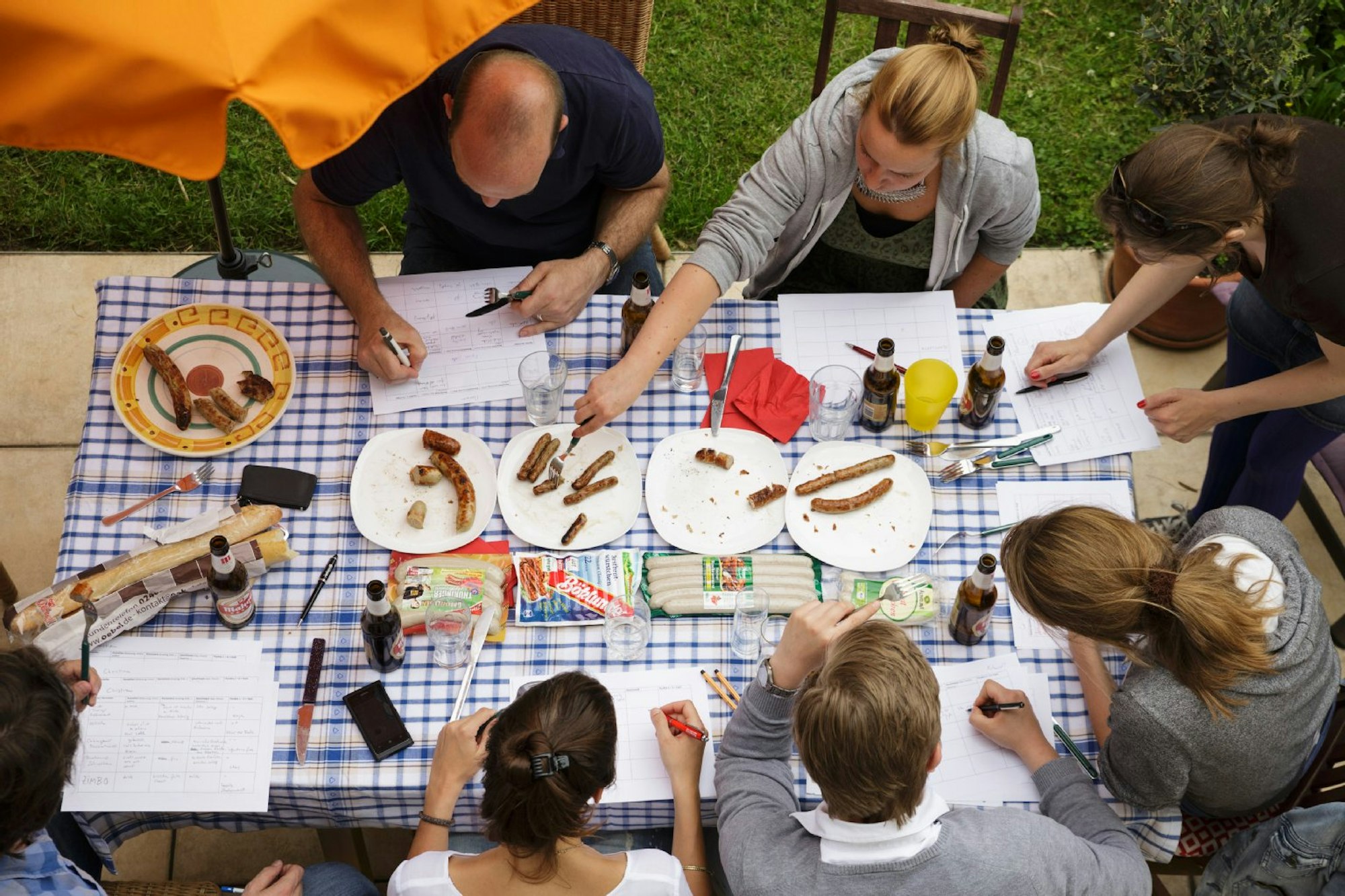 Die Plätze in unserer Würstchen-Testrunde waren heiß begehrt. In der Sonne sitzen und Grillwürstchen probieren, während die lieben Kollegen im düsteren Büro über dem Computer brüten, wie unverschämt.