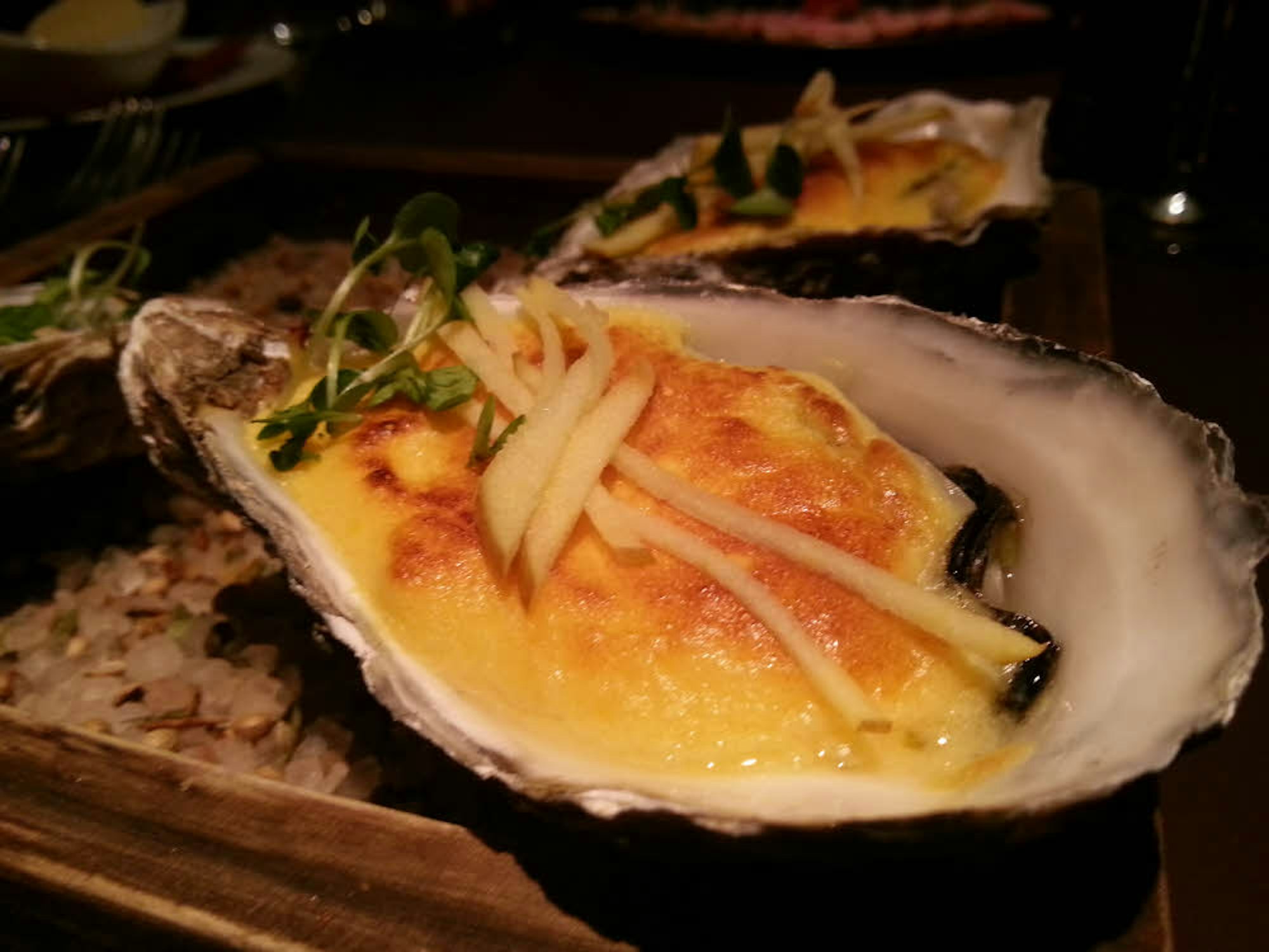 Drei Austern spéciales des Marennes N°2 Gillardeau gratiniert mit Apfelzabaione und Apfelstiften // 16 Euro