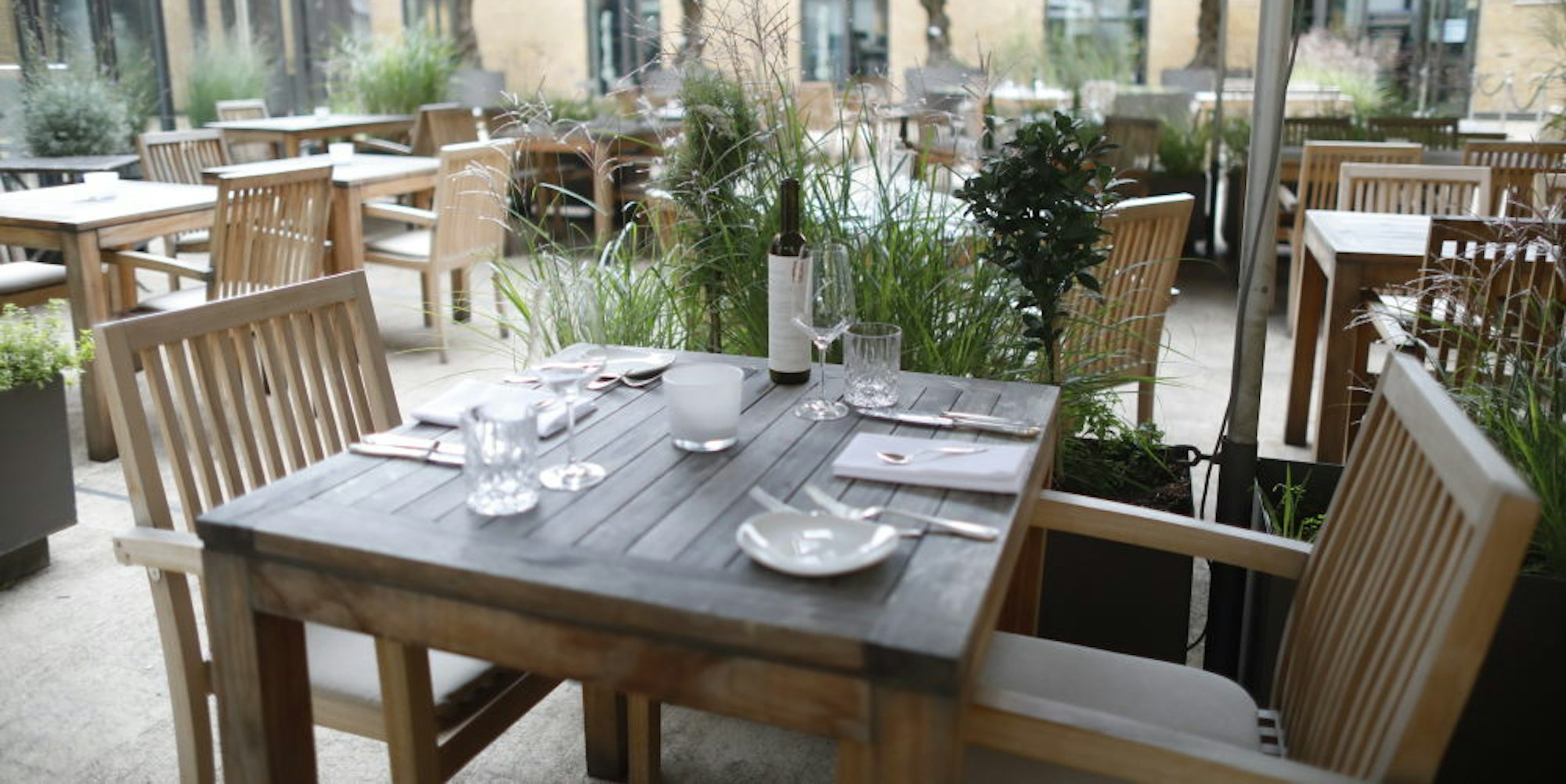 - In dieser Folge: Die Terrasse des Restaurants „Acht“ in den Spichernhöfen ist akkurat und klar strukturiert.