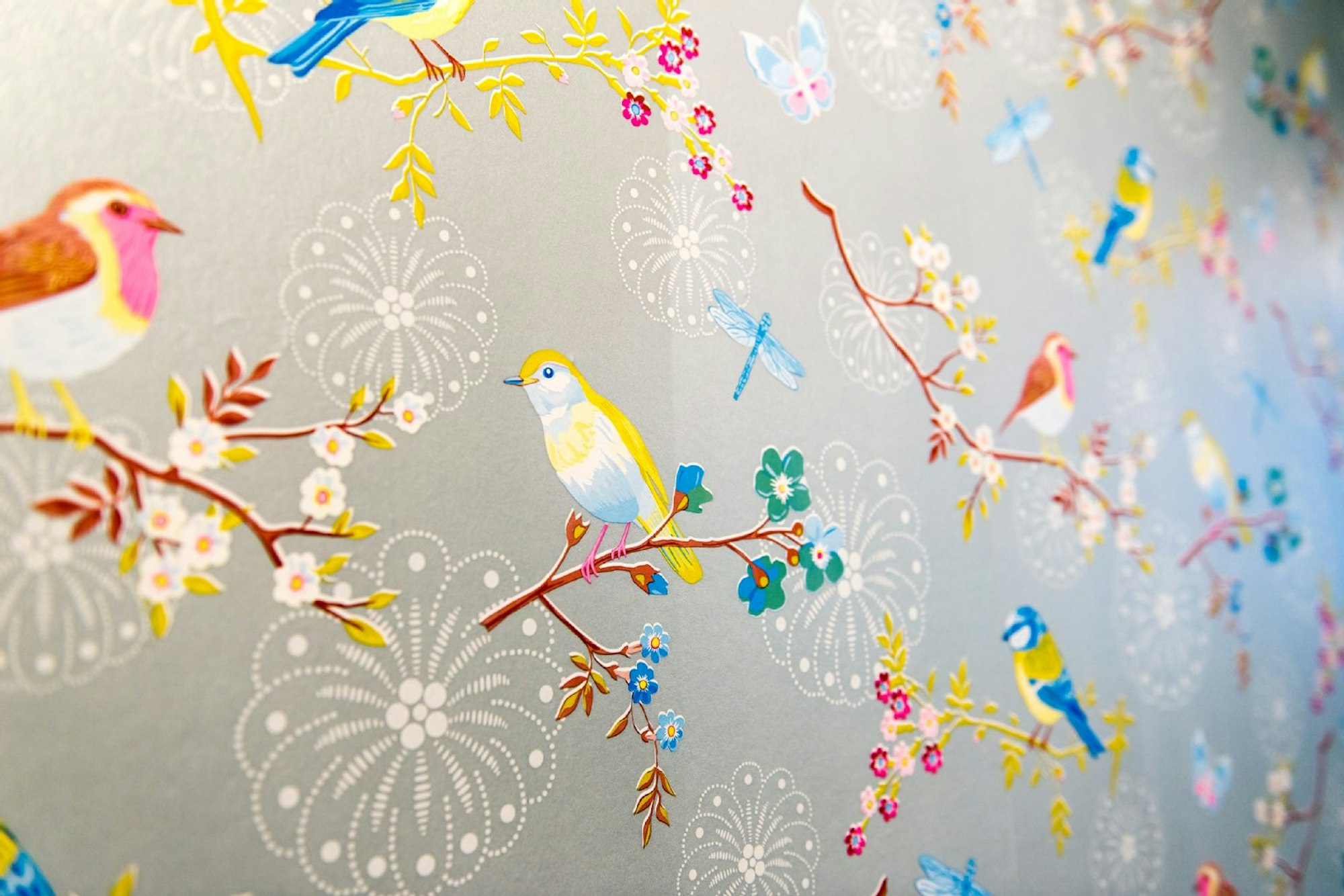 Vogelmotive kehren auf Tapete und Porzellan immer wieder.