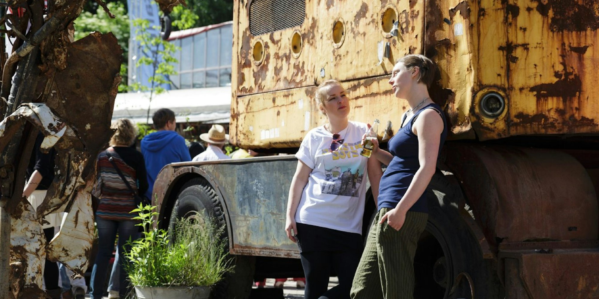 Zwischen Schrott und Grünpflanzen: Der Biergarten in Odonien ist ein besonderer Ort zum Genießen.