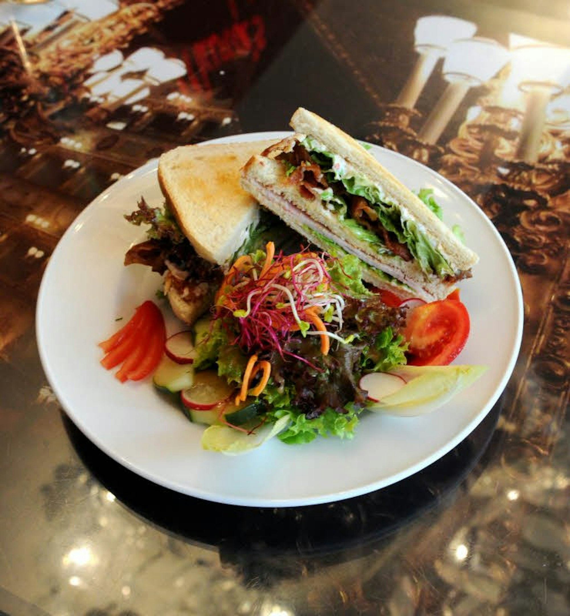 Täglich wechselt das Mittagsangebot. Der Kuchen ist hausgemacht und die Abendkarte tänzelt zwischen mediterran und asiatisch. Mein Favorit, das Club Sandwich. Nebenbei ein Cappuchino (oder Rieslingsekt der Hausmarke Hahnmühle) und zum Dessert ein glutenfreier Kuchen (einer steht immer zur Auswahl).
