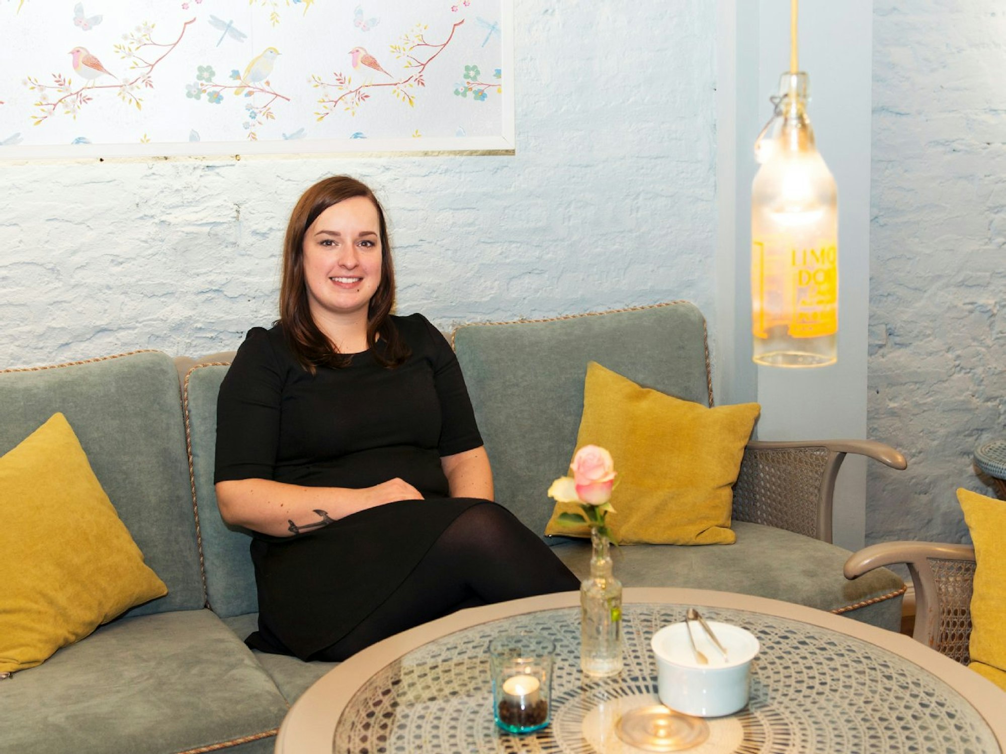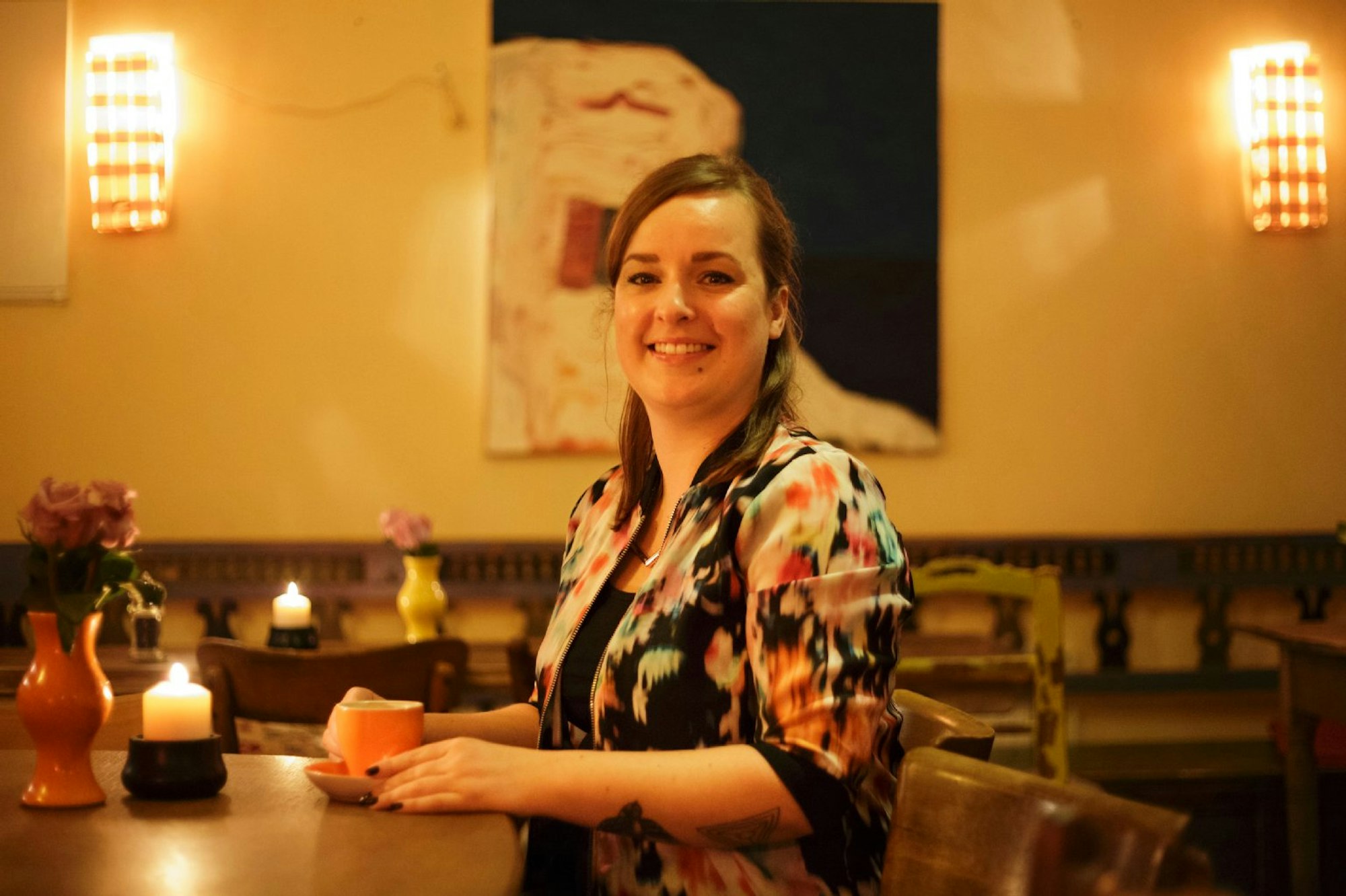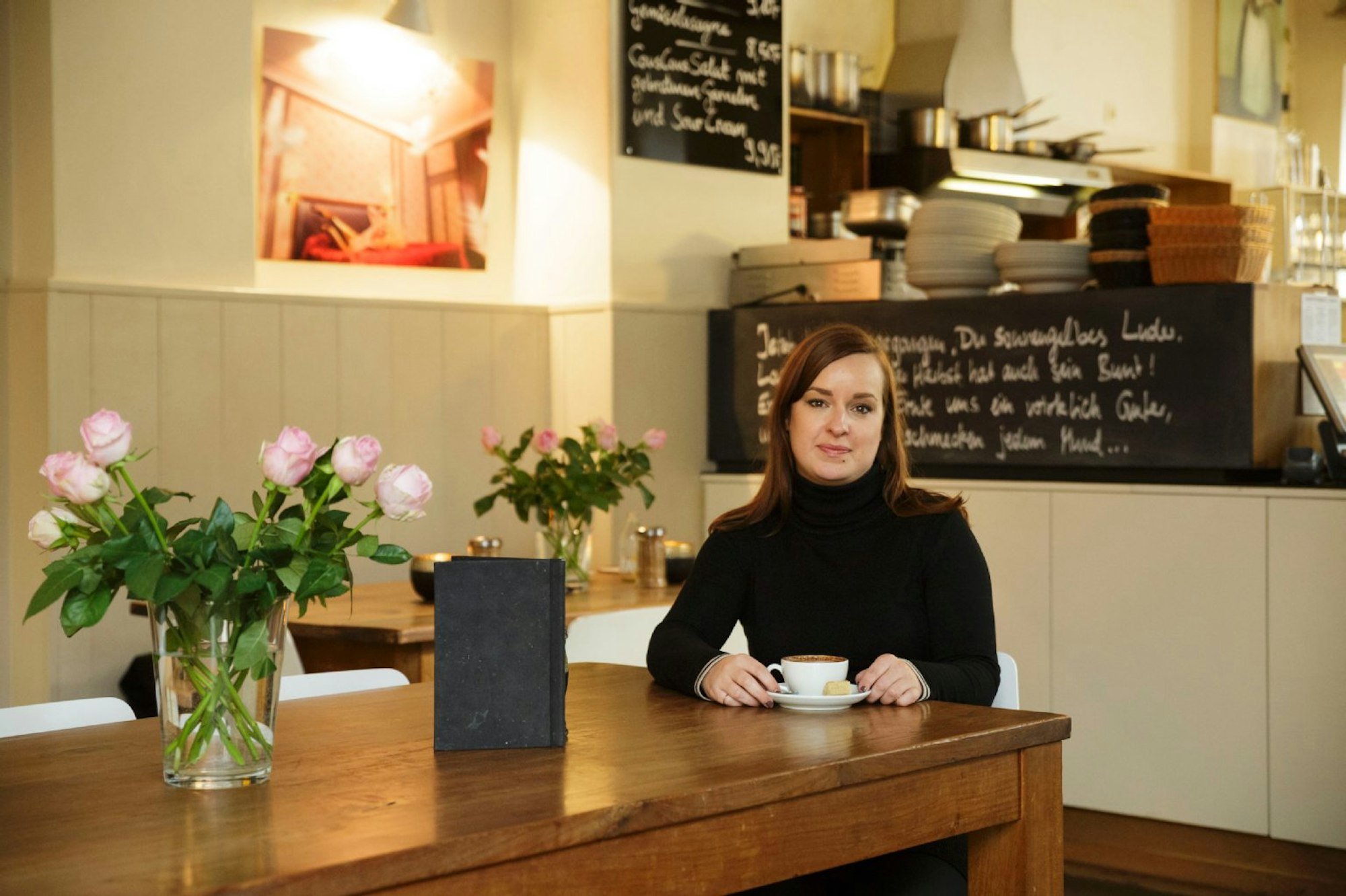 Julia Floß bei Kaffee und Kuchen im Café Rotkehlchen.