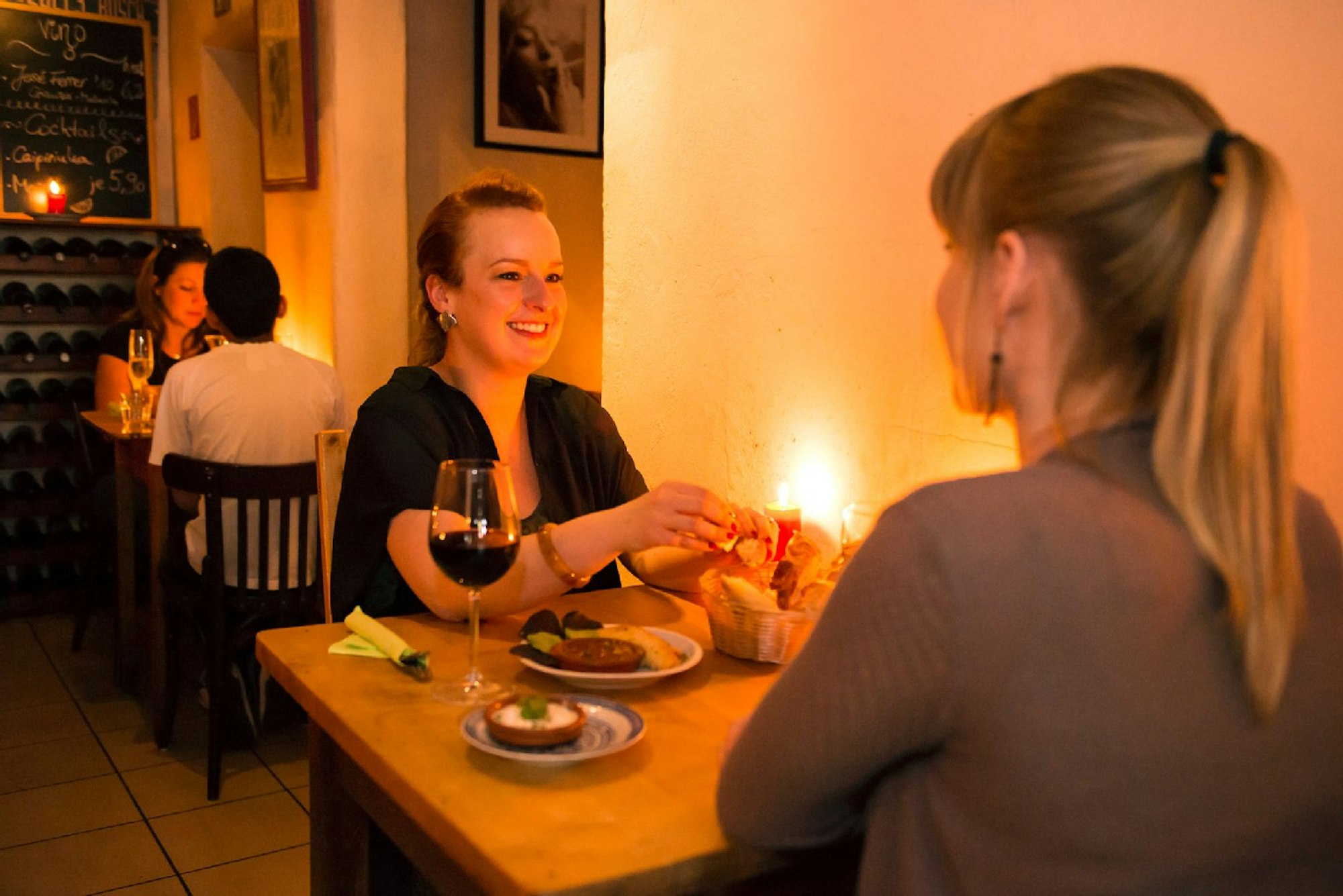 Das Pablo widerlegt mühelos alle meine Vorurteile und schreibt mit hocherhobenem Haupt Klassiker wie Datteln im Speckmantel, Patatas Fritas und Lamm mit Pflaumen aufs Menü. Das Restaurant ist so schlicht wie seine Fassade. Auf jedem Holztischchen steht eine Kerze, an der Wand hängt eine Tafel mit Tagesangeboten und die Karte besteht aus drei Blättern: Tapas, Rotwein, Weißwein – das war’s.