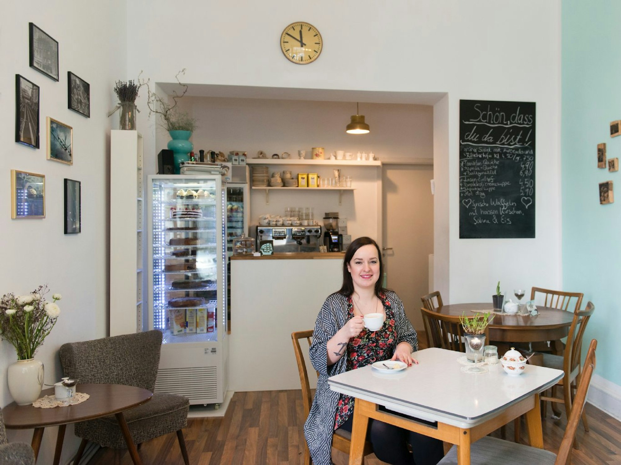 Die Jugendstilfliesen sind zwar an vielen Stellen zerschlagen, aber dennoch wunderhübsch. Auf den antiken Holztischen stehen Blumensträußchen und Zuckermenagen mit Goldrand oder Zwiebelmuster. Nicht nur das Porzellan stammt von der Mutti (oder Großmutti) sondern auch der hervorragende Kuchen. Täglich wird gebacken: Von der Schokotorte über Rhabarberstreuselkuchen bis zum Erdnussbutter-Cupcake wird alles mit viel Liebe gemacht – und das schmeckt man auch.
