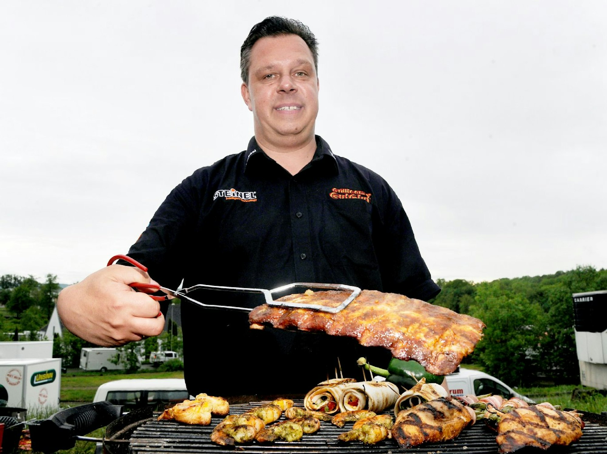 Michael Hoffmann, Teamchef des Grillteam Gut Glut an seinem Grill, Spareribs.
