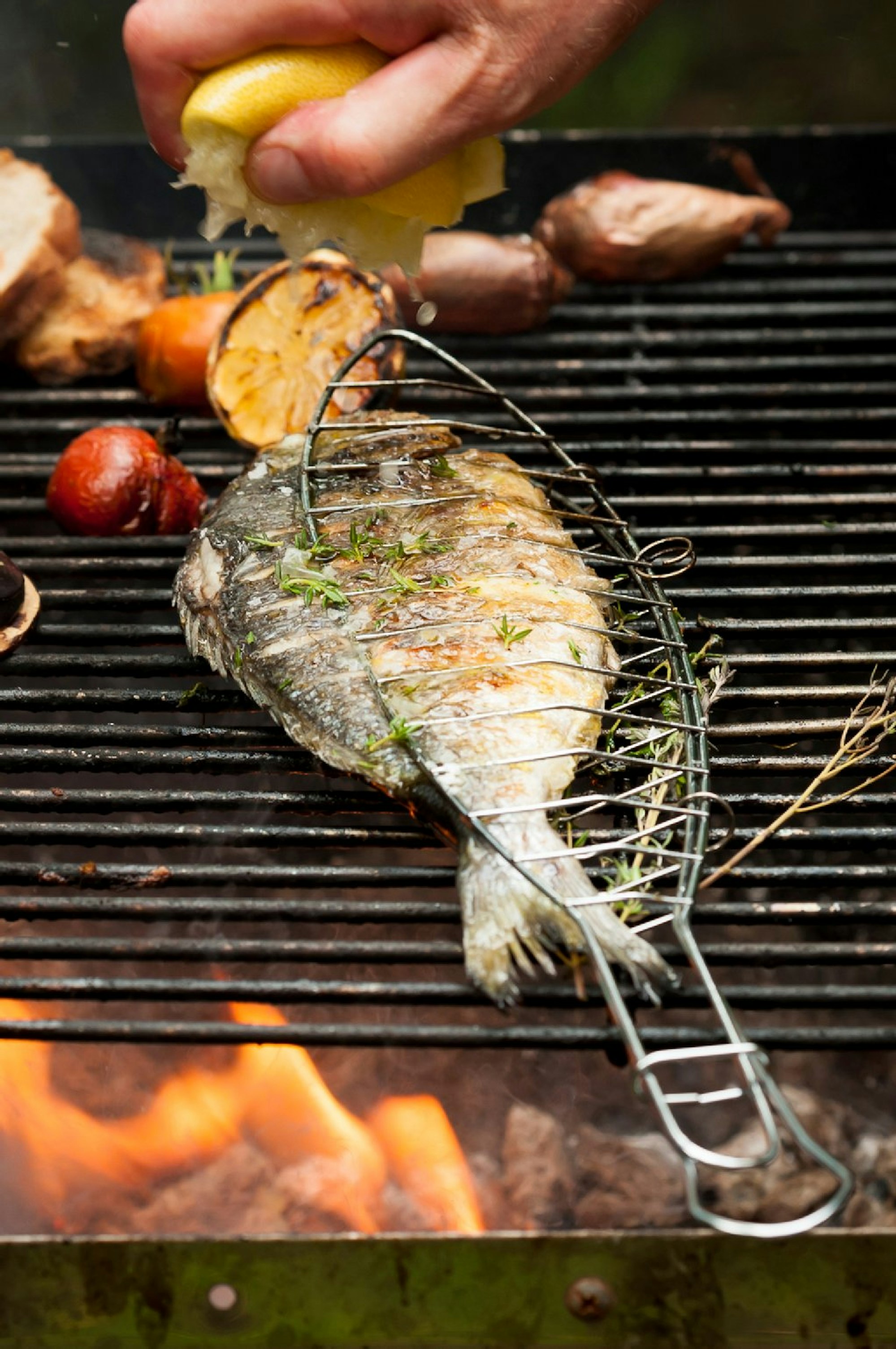 Grillkörbe, in die Fische und Fischfilets eingespannt werden, sind eine sinnvolle Erfindung. Damit kann der Grillrost zusammen mit dem Fisch gewendet werden. Aber Achtung: Vor dem Öffnen des Korbes sollte der Fisch mit einem Messer vorsichtig von den Stäben gelöst werden. Auch wenn sie den Fisch mit einer Marinade bepinseln und diese für einige Minuten ohne Hitze einwirken lassen, löst sich der Fisch vom Rost.