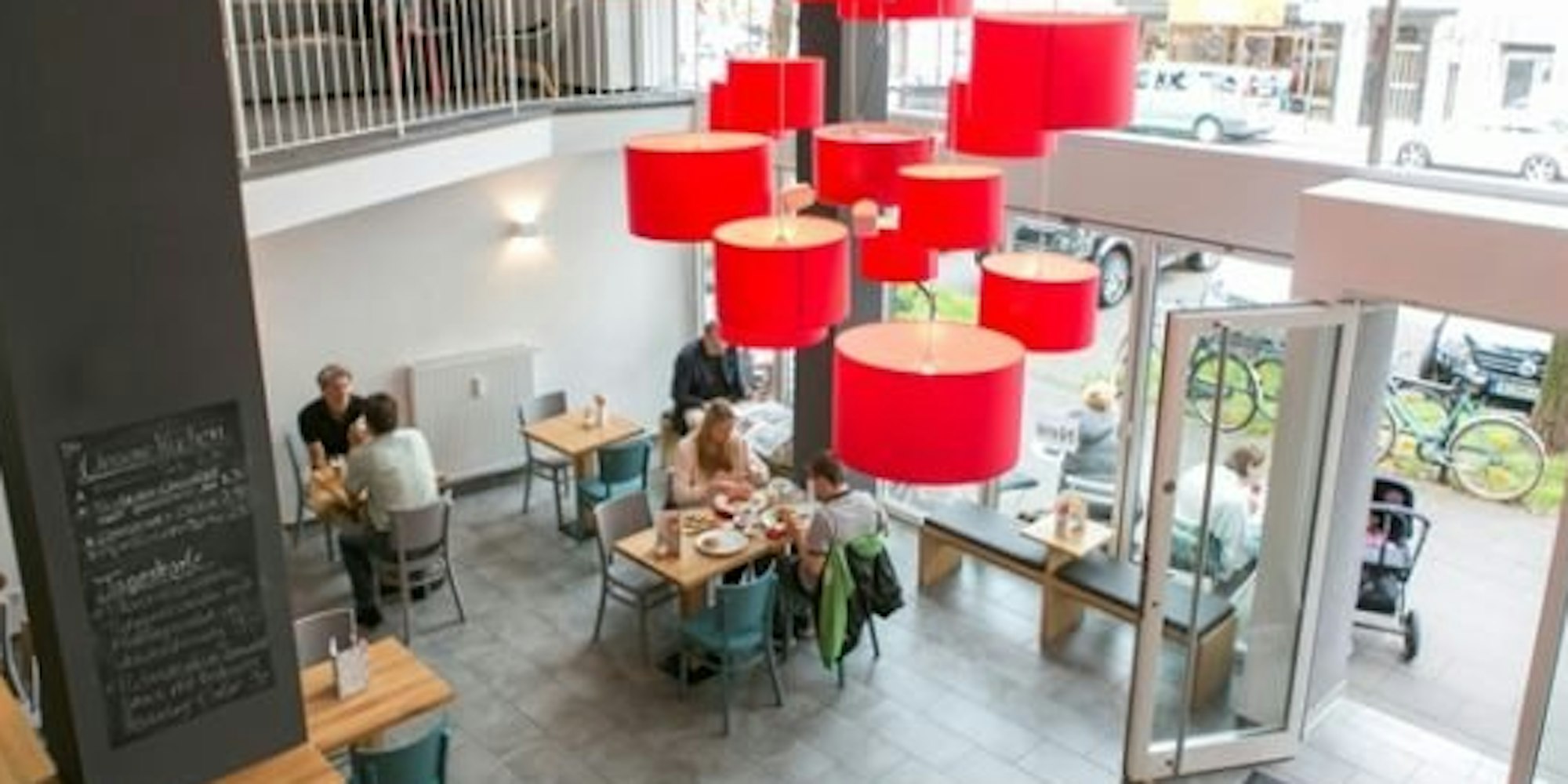Entspannte Atmosphäre unter roten Hängeleuchten im „Wo ist Tom“.