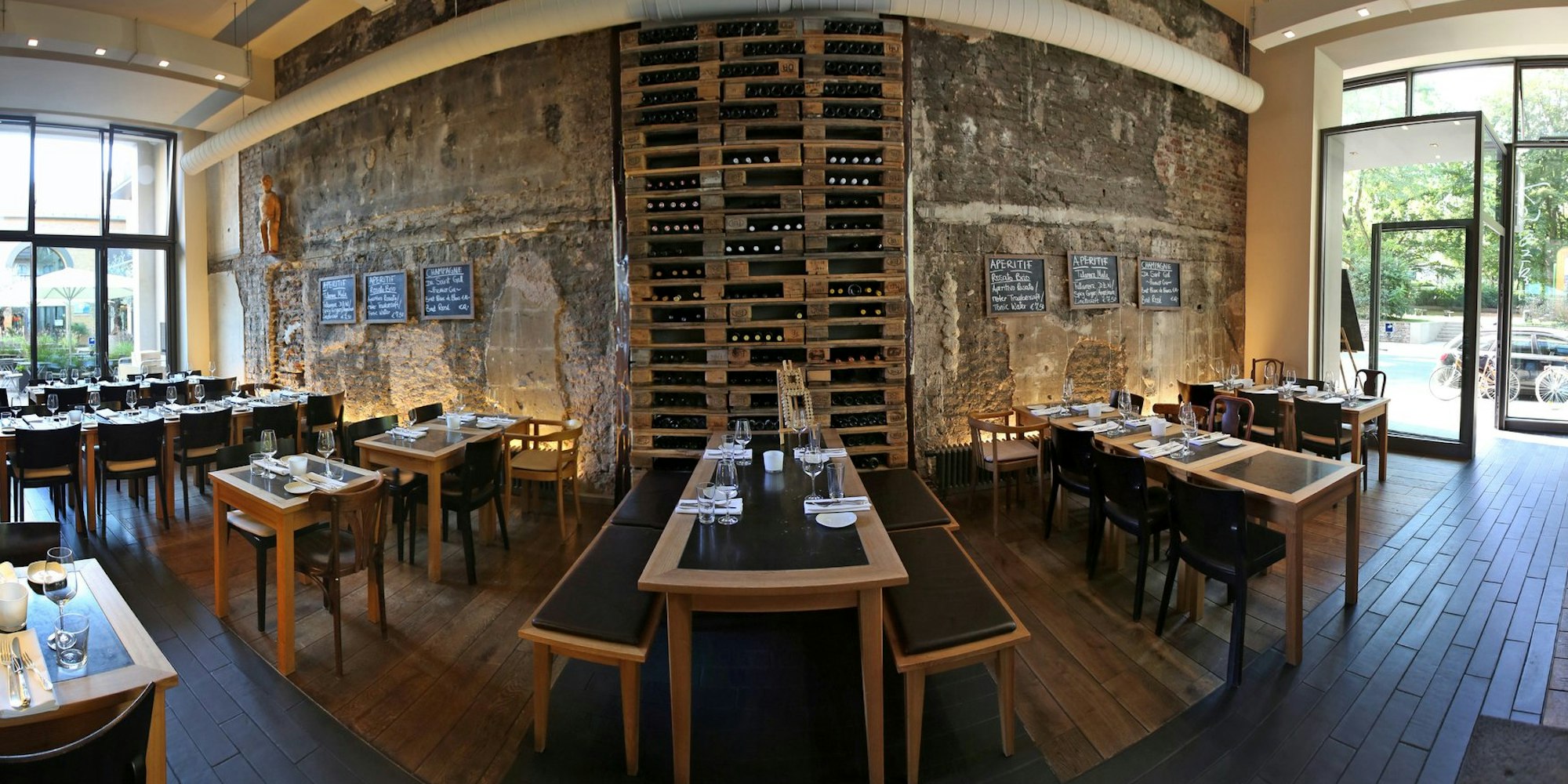Die Inneneinrichtung setzt mit unverputzten Wänden und Weinregalen aus Paletten auf Industrial Chic.