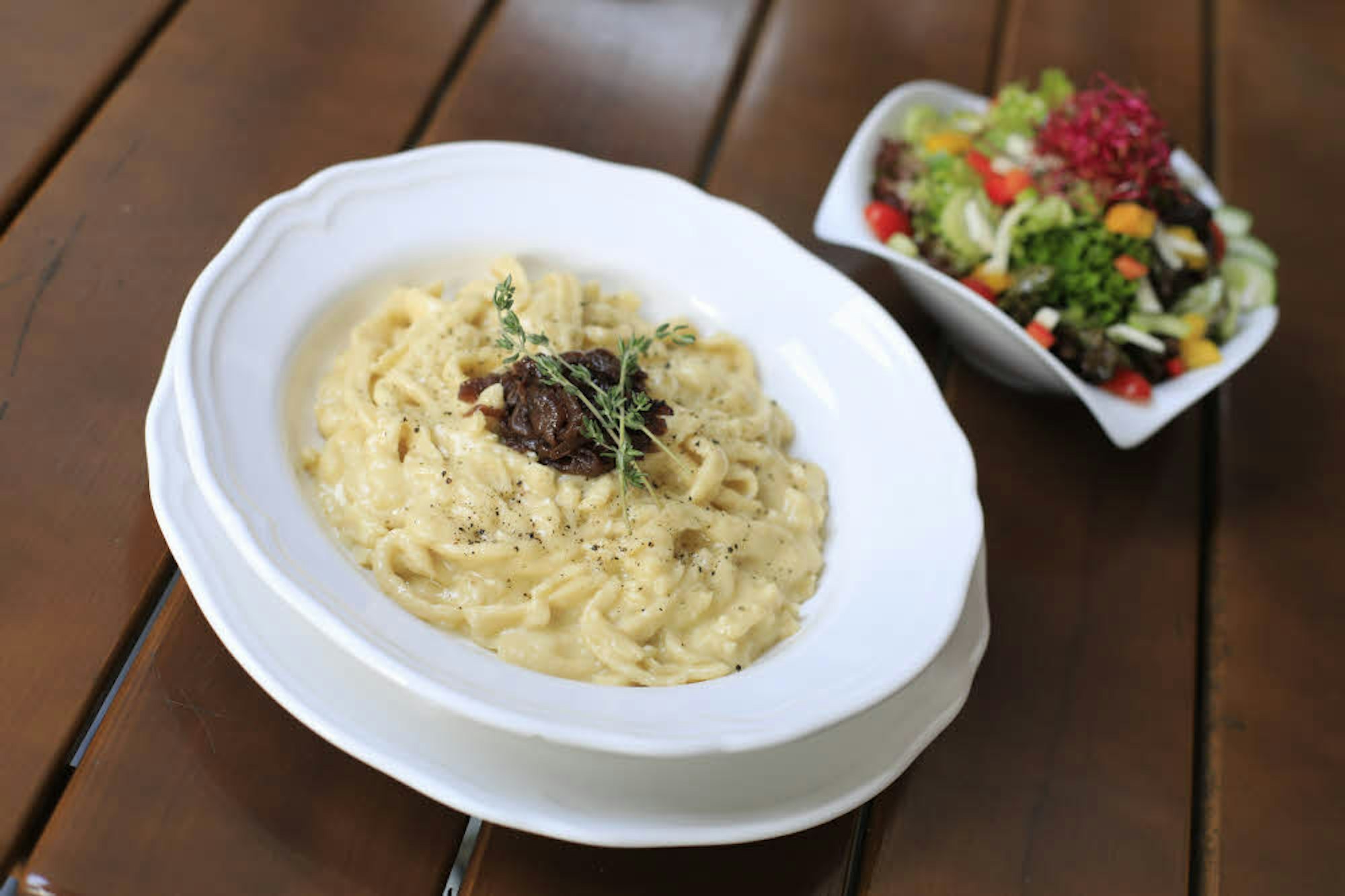 Schwäbische Käsespätzle mit Schmorzwiebeln und Salat // 12,80 Euro