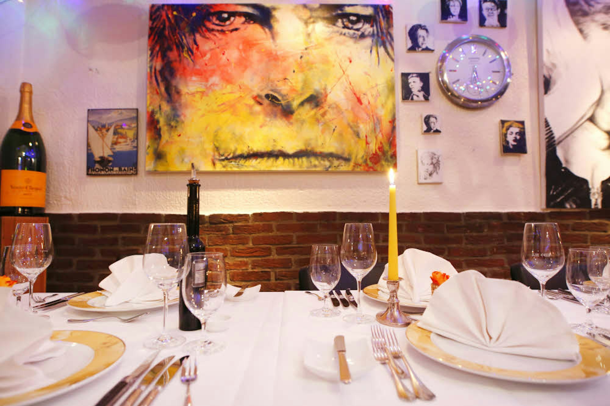 Die Konstante ist Stefan Helfrich, seit 1988 hauptamtlich Seele des Hauses. Ein schillernder Charakter, der sich in der überbordenden Deko wiederfindet. Zurzeit ist sie für hiesige Verhältnisse mit einigen Lichterketten, Lampions, Discokugel und Federboas fast karg. An den Wänden beeindrucken Bowie-Gemälde von Gerald Schäfer.