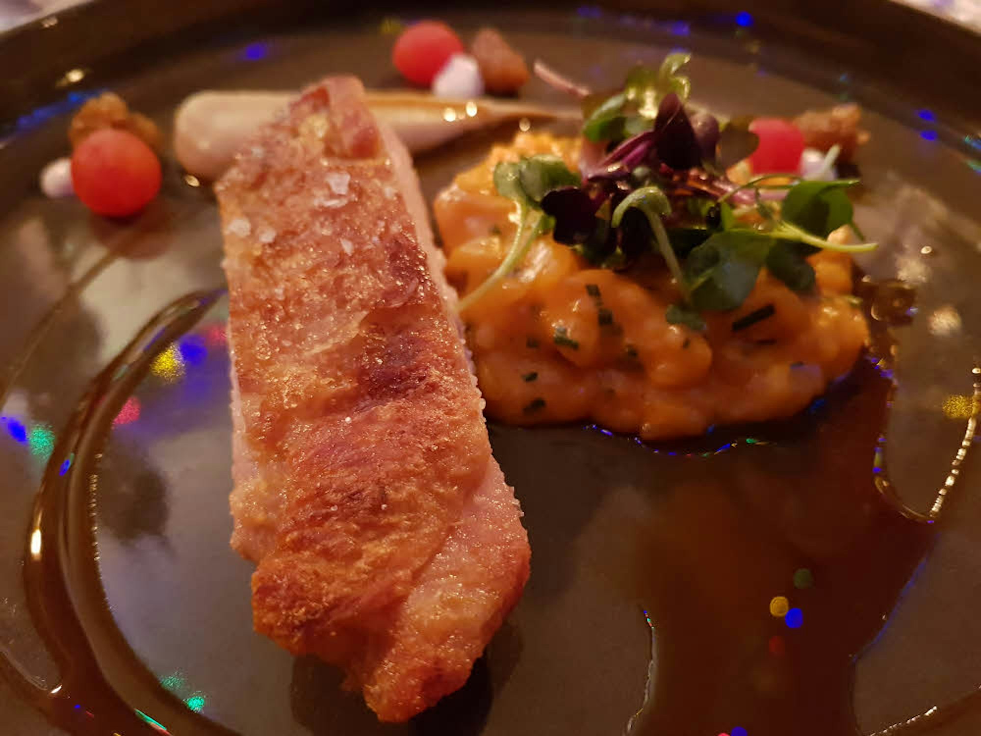 In den folgenden Gängen zeigt Herbig nur gezügelten Innovationsdrang, würzt jedoch angenehm prägnant. Die Perlhuhnbrust kommt mit knuspriger Haut und einem Touch Salz auf den Tisch, das begleitende Tomatenrisotto bietet Biss und Säure, Maulbeeren und Ziegenfrischkäse verleihen spannungsvolle Akzente. Eine Kalbsjus legt gekonnt die würzige Grundlage.