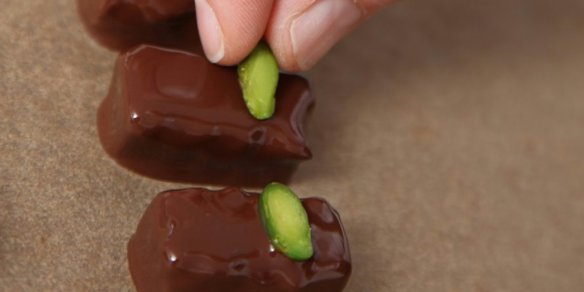 Mit halben Pistazien wird die Praline verziert.