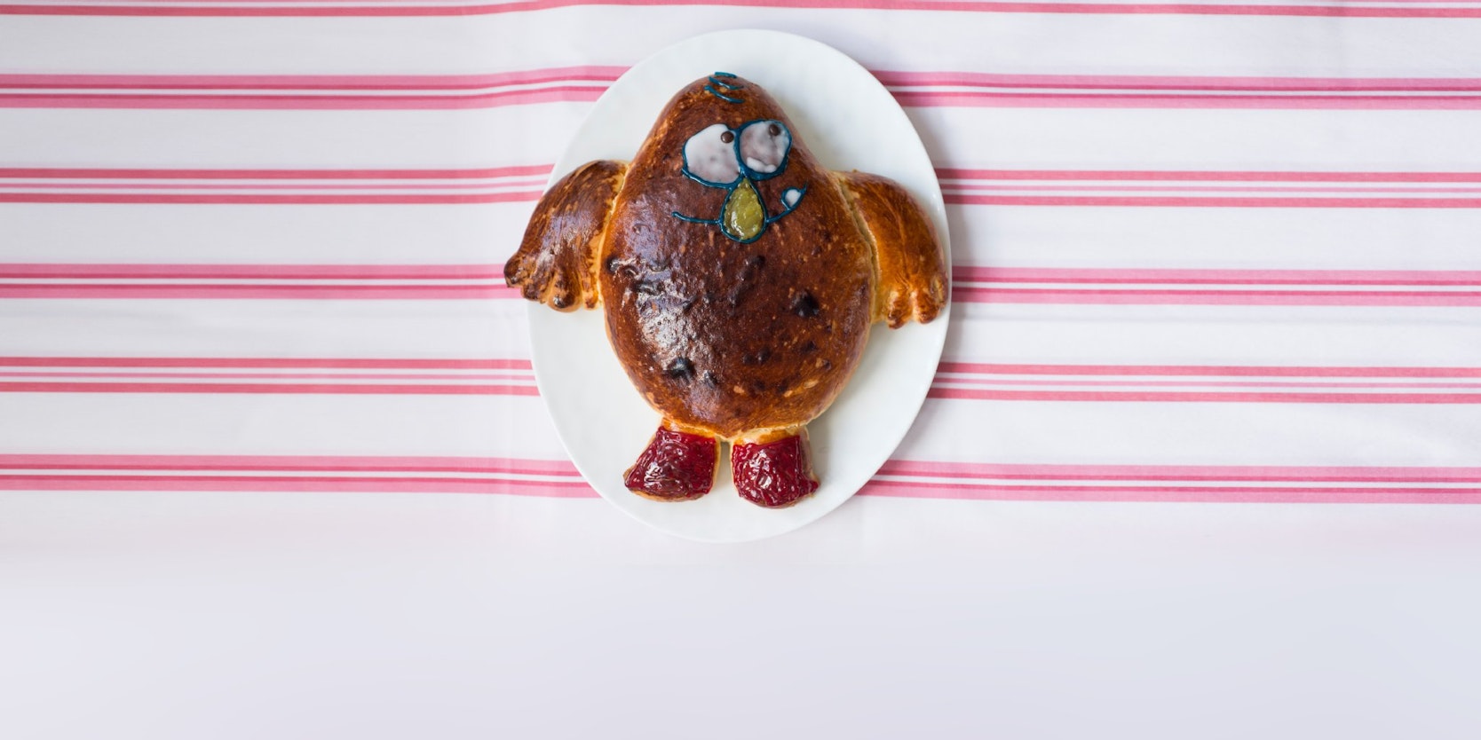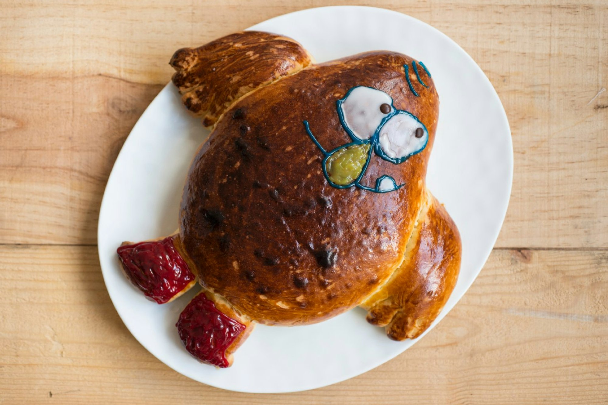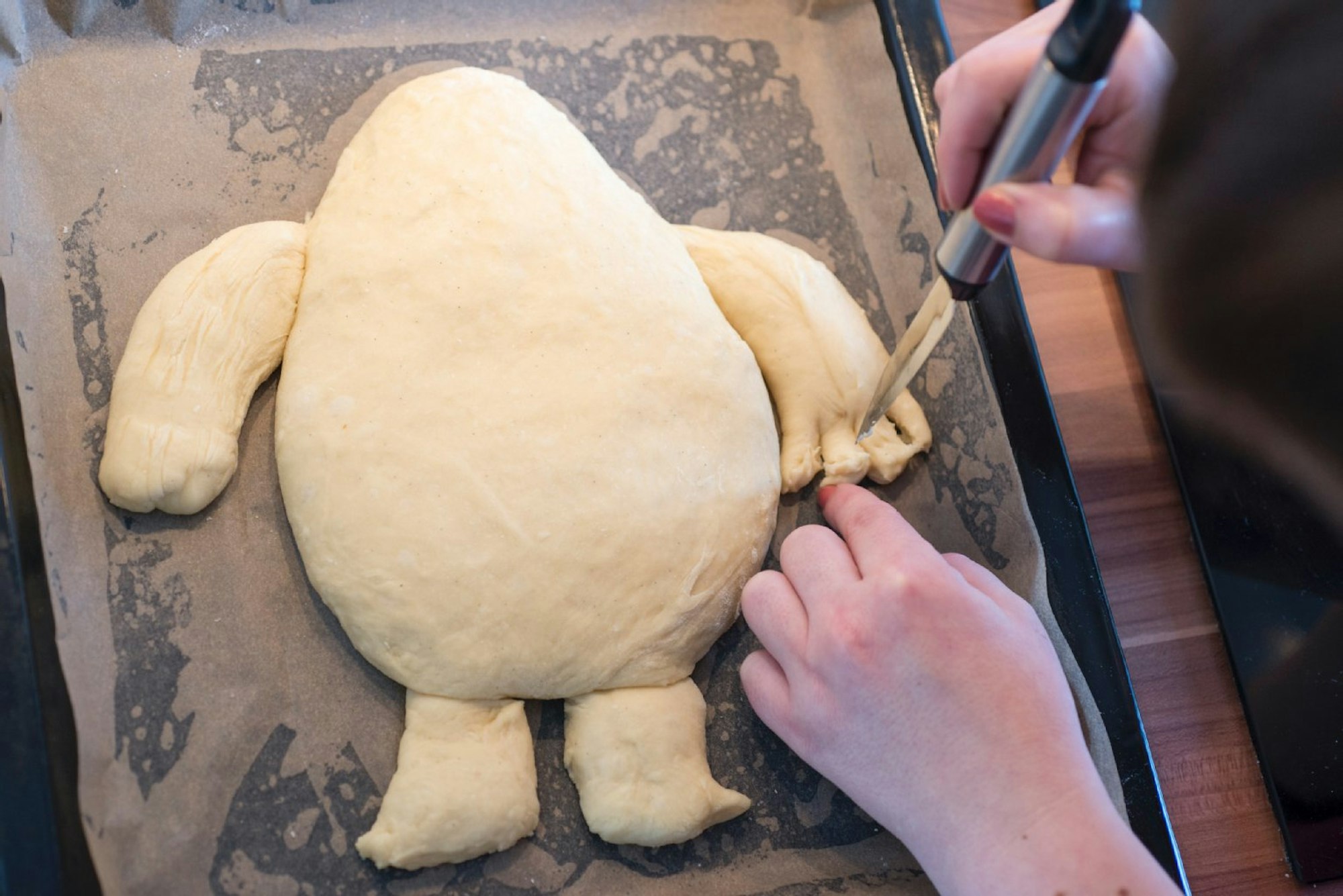 Den Ofen auf 180˚ C vorheizen. Den Teig auf die Arbeitsfläche geben und zusammenschlagen. Sollte er zu klebrig sein, ruhig mit etwas Mehl arbeiten – das hängt unter anderem mit der Aktivität der Hefe zusammen. Den Teig zu einer Rolle formen und vier kleine Stücke für die Arme und Beine von Karli zur Seite legen. Aus dem Rest den Körper formen und auf ein Blech mit Backpapier legen. Die Arme und Beine einfach andrücken und zurechtformen. Die Arme mit einem Messer einschneiden, so dass die Finger entstehen. Karli muss mindestens eine halbe Stunde auf dem Blech gehen. Dieses zusätzliche Volumen sollte man beim Formen im Hinterkopf behalten und entsprechend die Arme und Beine weit genugabspreizen.