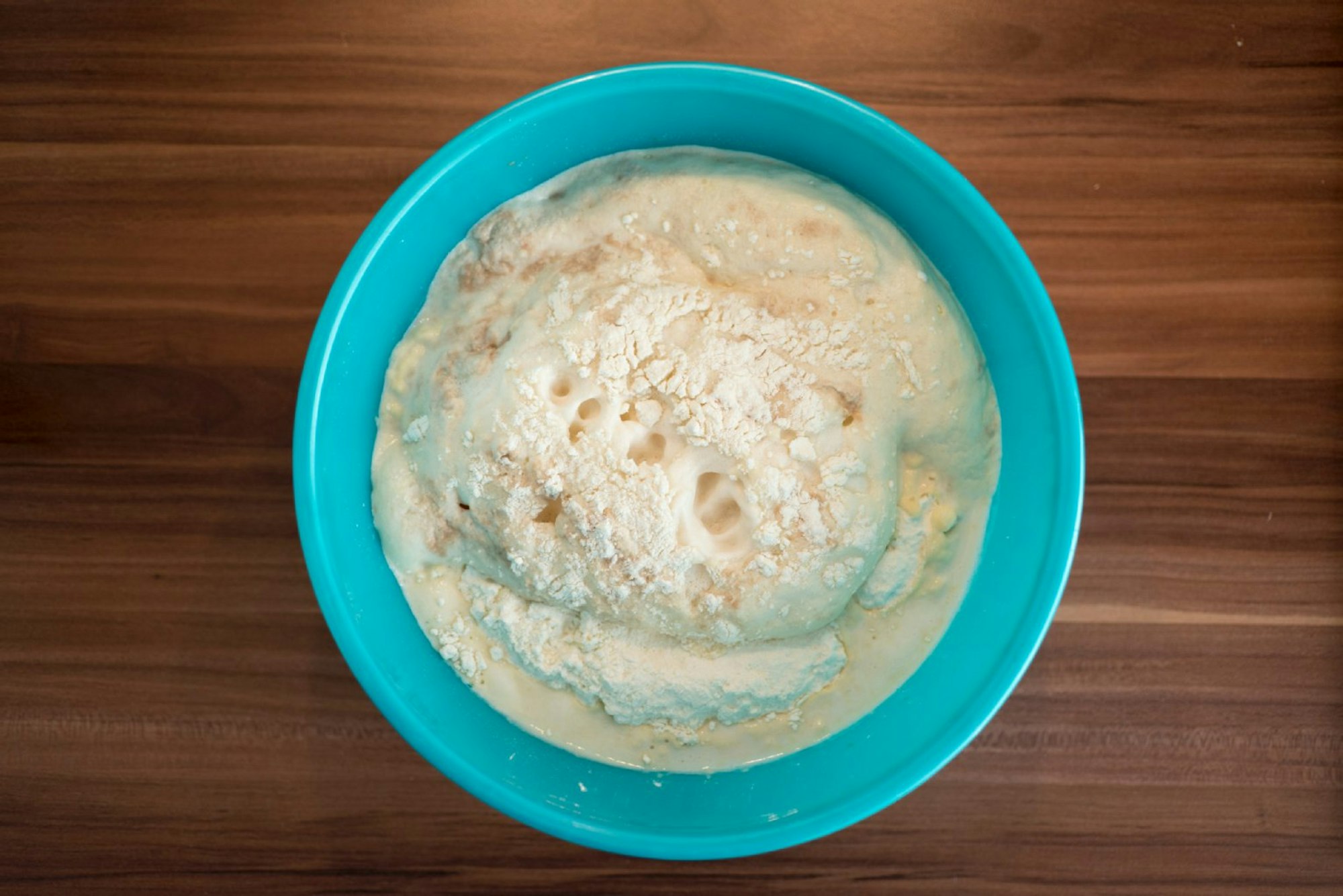 Der Vorteig wirft Blasen, die Hefe ist aktiv.