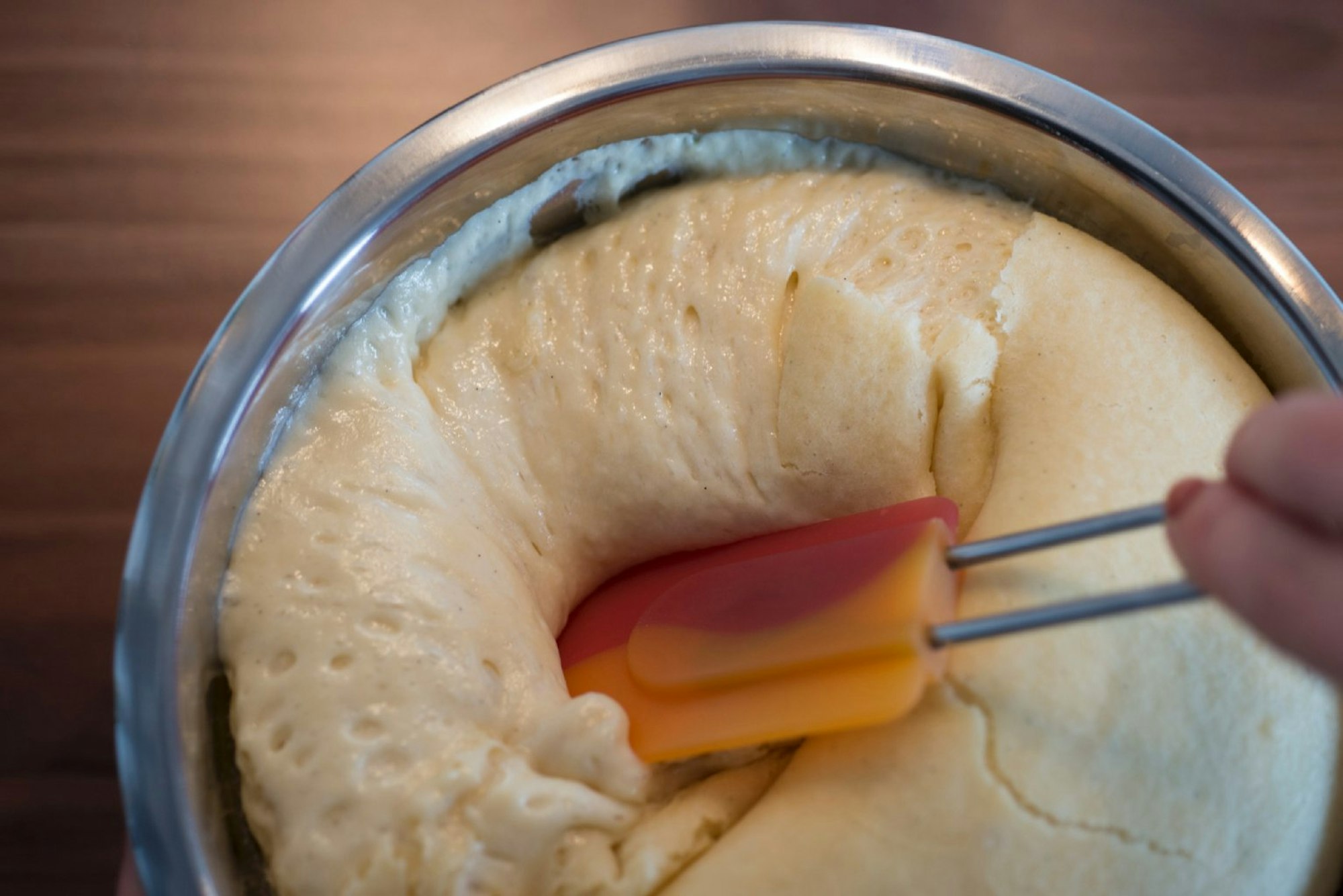 Den Vorteig entweder in einem Schlagkessel mit einem Knethaken mischen oder mit dem Handrührgerät (Knetaufsätzen benutzen).