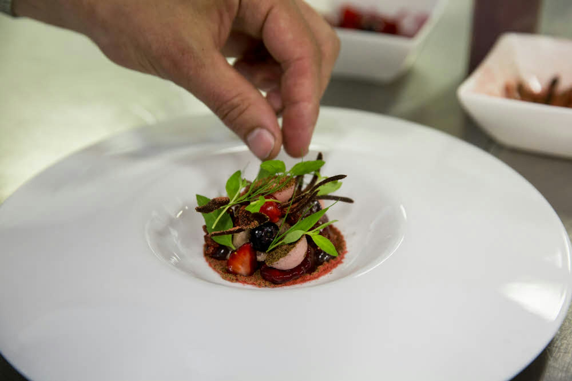 Torben Schuster serviert zusätzlich ein fluffiges Beerenmousse, sogenannte „Himbeer-Rocks“ und filigrane Schokoladenhippen.