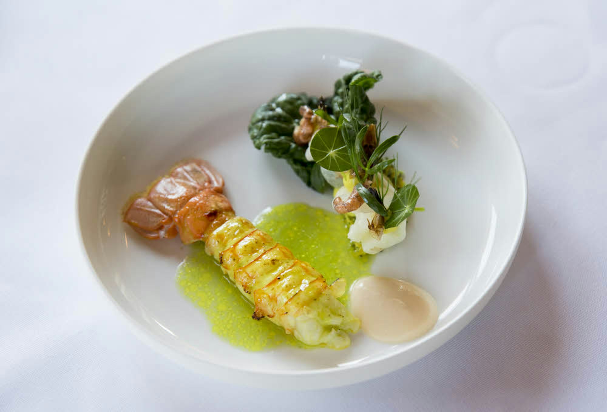 Den Kaisergranat mit etwas Curry-Öl beträufeln und mit einem Bunsenbrenner anrösten. Curry-Creme tupfenweise auf dem Pak-Choi-Blatt anrichten. Essiggemüse, Nordseegarnelen und gezupfte Kräuter darauf verteilen. Ceviche-Creme tupfenweise verteilen.