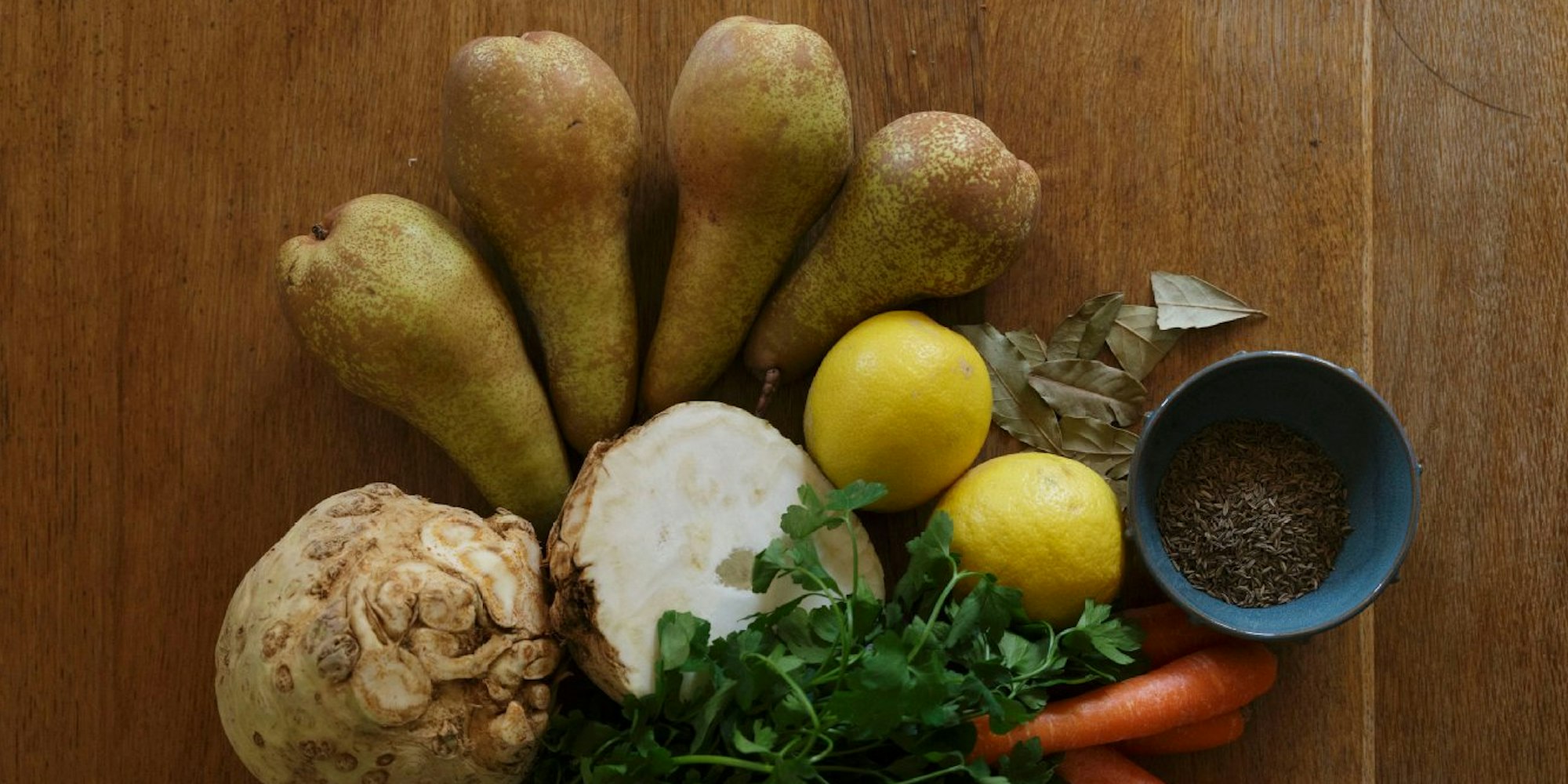 Zutaten (für 6 Portionen):1 große Knolle Sellerie 3 Birnen3 Möhren1 Zwiebel1 Bund PetersilieZitrone1 Lorbeerblatt1 Prise Kümmel1 Prise Kardamom, gemahlenPfeffer, SalzRapskernöl