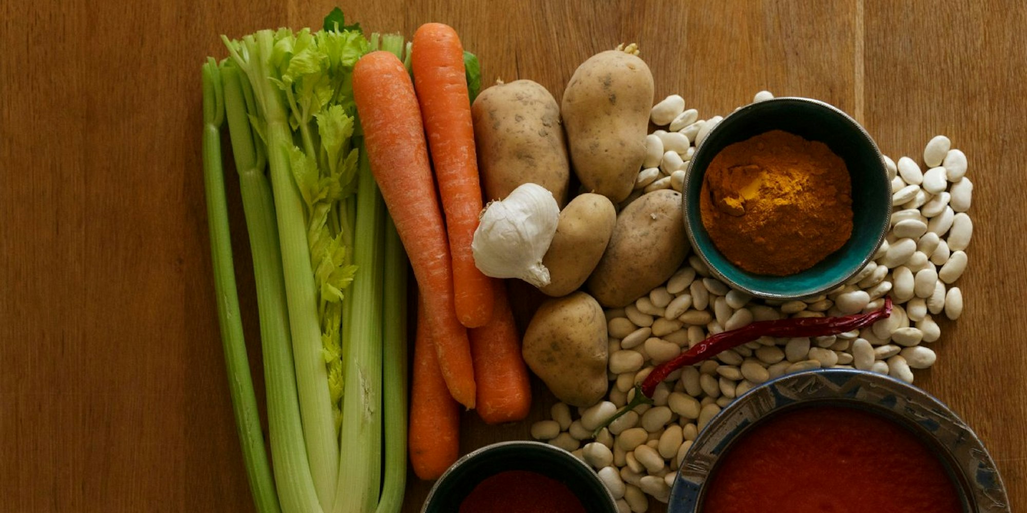 Zutaten (für 4 Portionen):500g weiße dicke Bohnen, über Nacht einweichen und 3 Stunden kochen. 250 g Kartoffeln 2-3 Stangen Staudensellerie3 Möhren2 Zwiebeln1 Knoblauchzehe1 TL Paprikapulver (süß)1 TL Koriander, gemahlen TL Kurkuma, gemahlenChilipulver680 ml passierte Tomaten (eine Flasche)OlivenölSalzZitrone