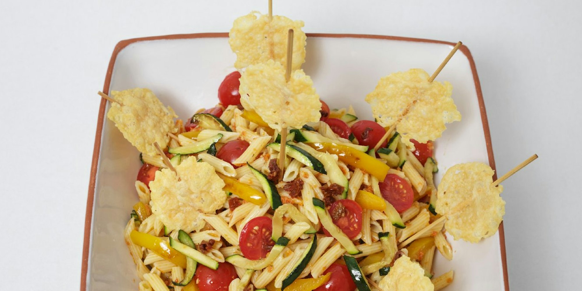 Mediterraner Penne-Salat mit Parmesan-Lollys.