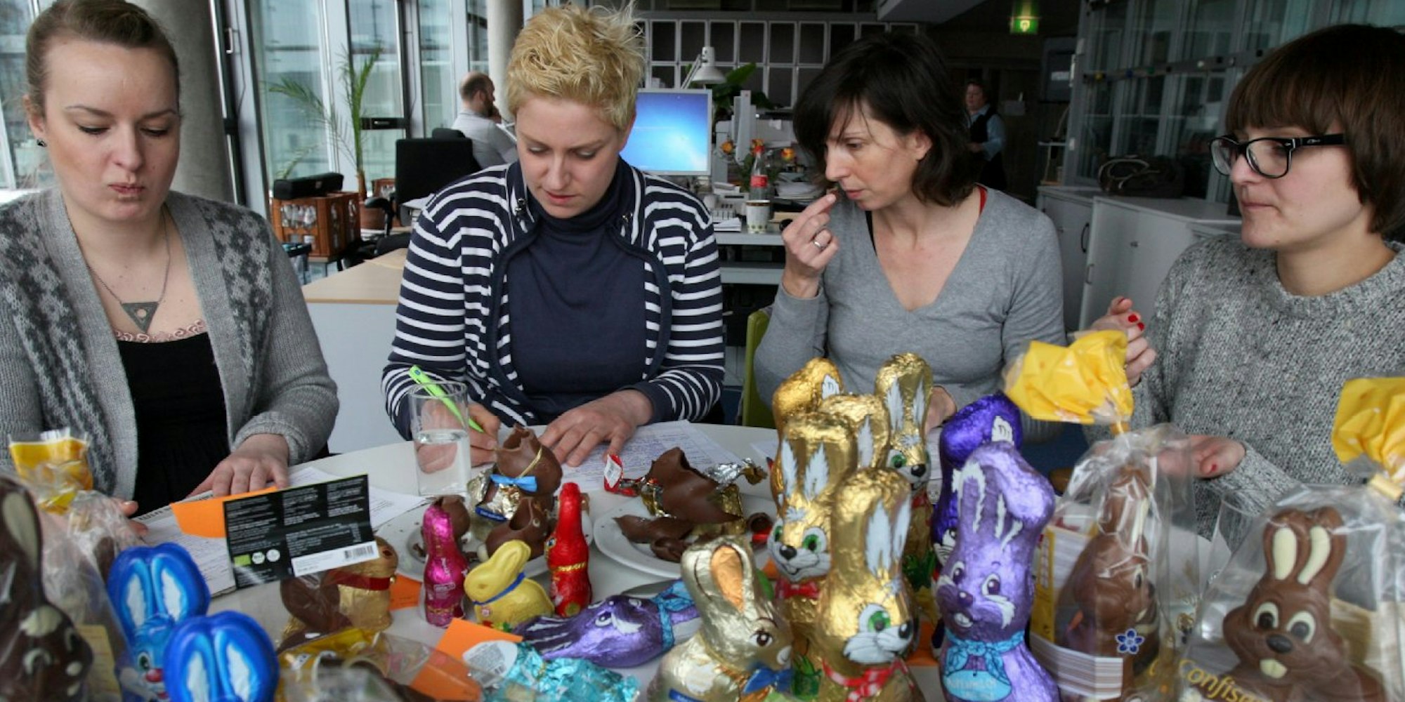 Als es also ernst wurde mit den Osterhasen, brachte Eva Oelze die nötige Expertise in unsere Magazin-Juryrunde. Die Konditormeisterin und Imkerin ist nicht nur urteilsfest in allem, was Süßes betrifft. Als Chefin der „Choco lounge“, einer mobilen Pralinenmanufaktur, und als Dozentin für Torten- und Pralinenseminare kennt sie sich mit Qualitäten bestens aus. Entsprechend entsetzt war sie über einige der 15 getesteten Produkte. Denn alle haben, wie jede Schokolade, einen sehr aufwendigen Verarbeitungsprozess hinter sich.