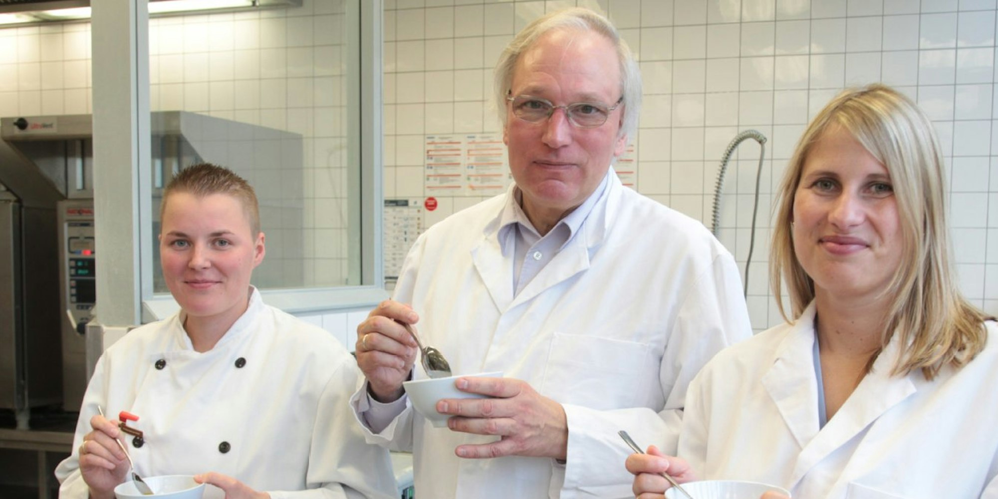 Kostprobe: Köchin Julia Albrecht-Godau aus dem Betriebsrestaurant des Neven DuMont Haus, Kultur-Redakteur Markus Schwering, Magazin-Mitarbeiterin Christina Rinkl
