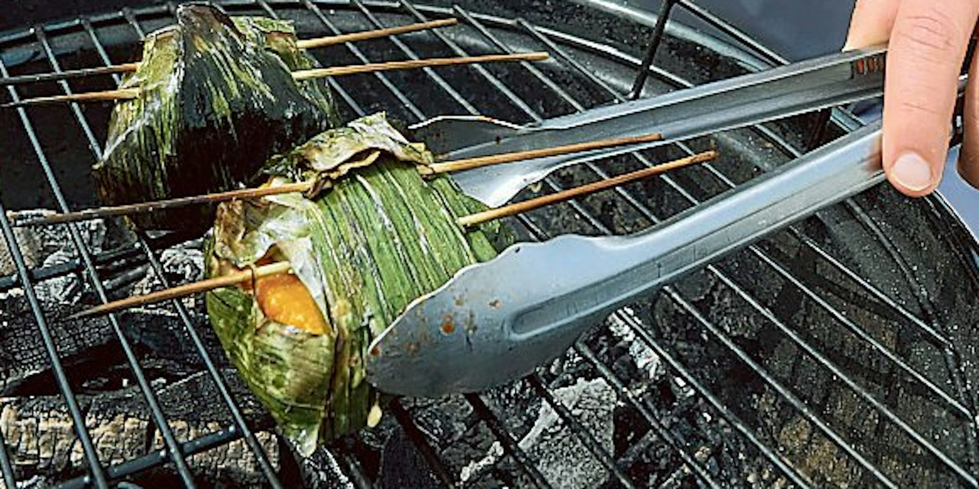 Bananenblätter können auch mit Holzspießen verschlossen werden. Die sollten vorher aber gründlich gewässert werden, damit sie nicht verbrennen.