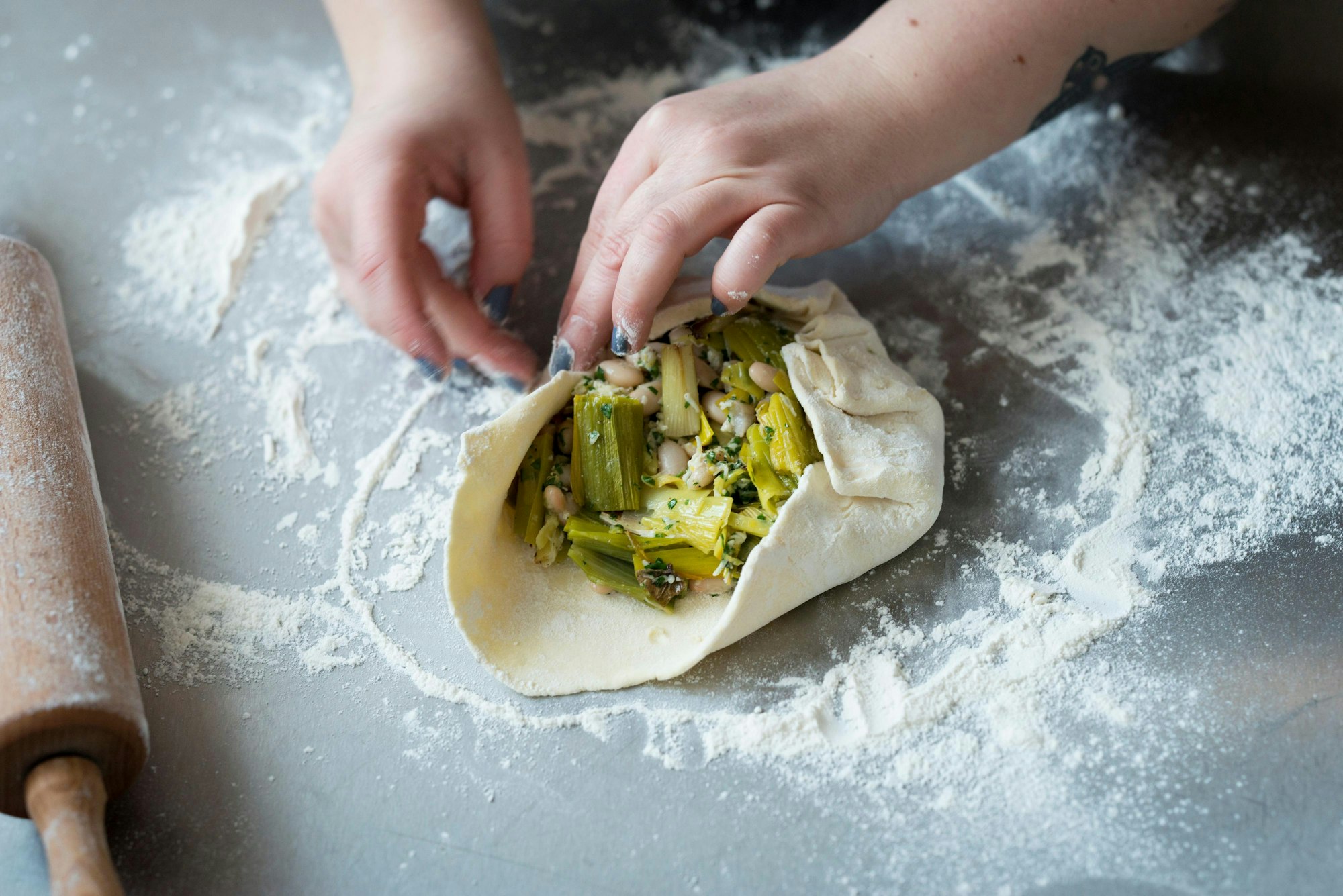 Füllung4 Stangen Lauch2 TL OlivenölSalz, Pfeffer400 g weiße Bohnen (Konserve)1 Knoblauchzehe, fein gewürfelt1 Zitrone (Saft und Abrieb)½ Bund Thymian, gehackt¼ Bund glatte Petersilie, gehackt80 g Bergkäse, gerieben1 Eigelb1 TL Wasser