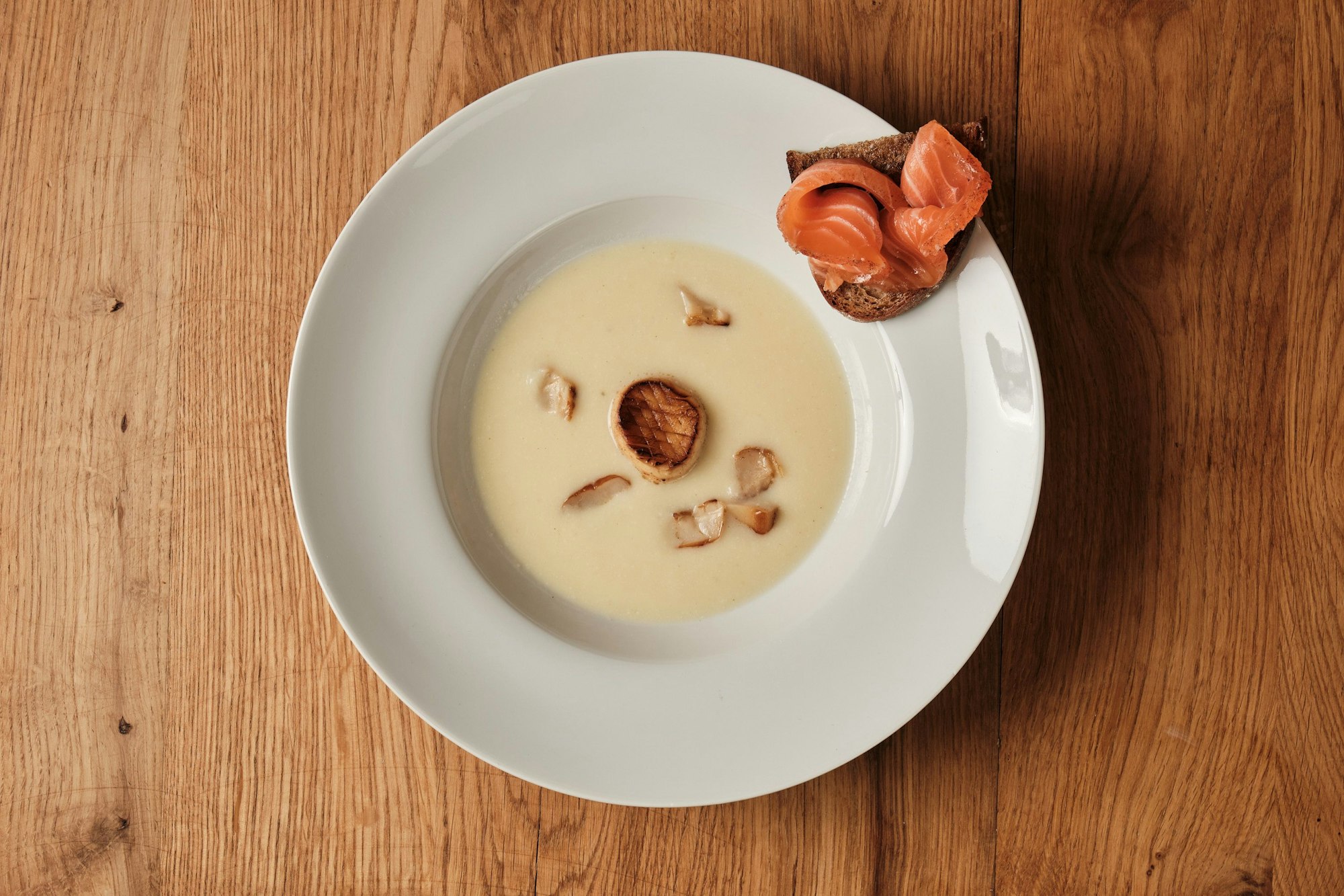 Heiße Pastinakencremesuppe in einen Suppenteller mit Rand füllen. In die Mitte einen Kräuterseitling-Scallops (Stiel) setzen. Hüte drumherum verteilen. Mit einem Klecks Crème fraîche den Roggenbrotchip am Tellerrand fixieren. Darauf zwei Scheiben gebeizten Lachs anrichten.