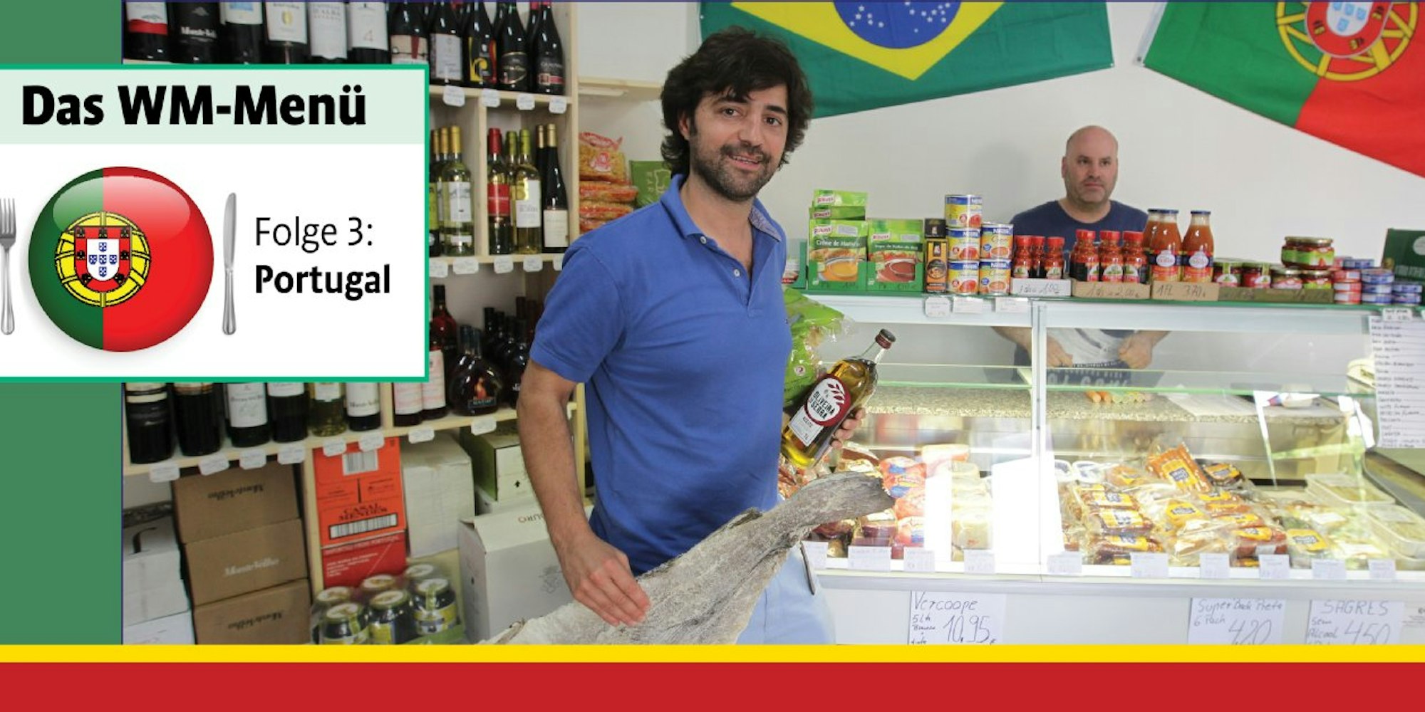 Ricardo Costa im portugiesischem Supermarkt mit dem Verkäufer Antonio Rosa. In der Hand hält er die Haupt-Zutaten für ein Bacalhau-Gericht: Kabeljau, Olivenöl und Kichererbsen.