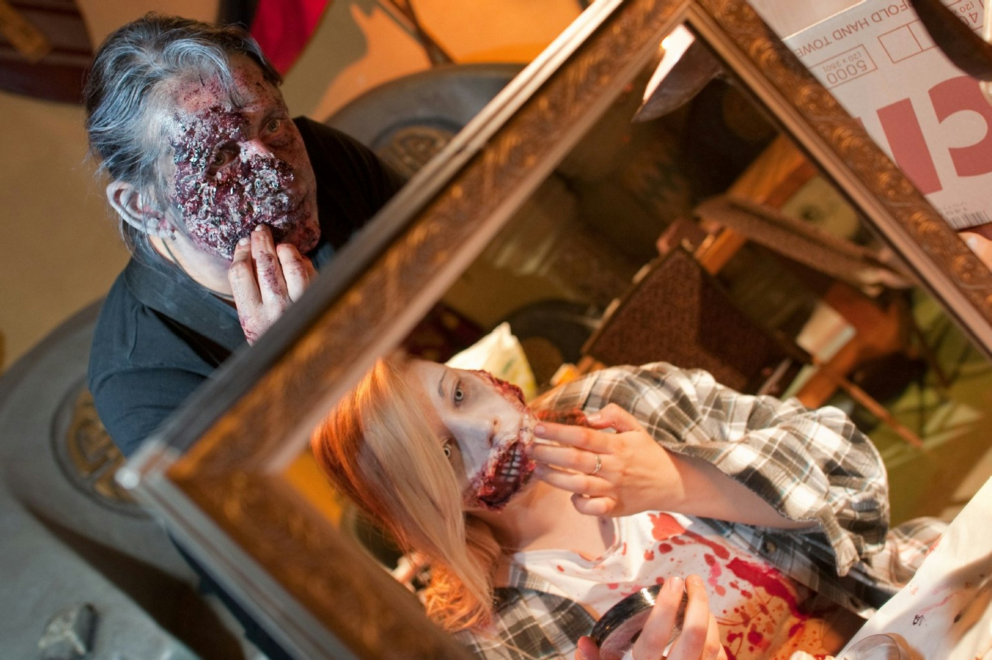 Wichtig ist beim Zombie-Make-up gnadenlose Ehrlichkeit zu sich selbst. „Schauen Sie sich vorher Ihr Gesicht genau an und betonen Sie dann alles, was Ihnen nicht perfekt erscheint“, rät Erschrecker Sylva. „Ziehen Sie zum Beispiel die Falten nach, betonen Sie Augenringe und die Augenhöhlen. Die Wangen wirken wie ausgesaugt, wenn man die Partie unterhalb der Wangenknochen mit dunkler Schminke einfärbt.“ Ein weiterer Tipp: Roter Lidstrich sorgt für kranke Augen.