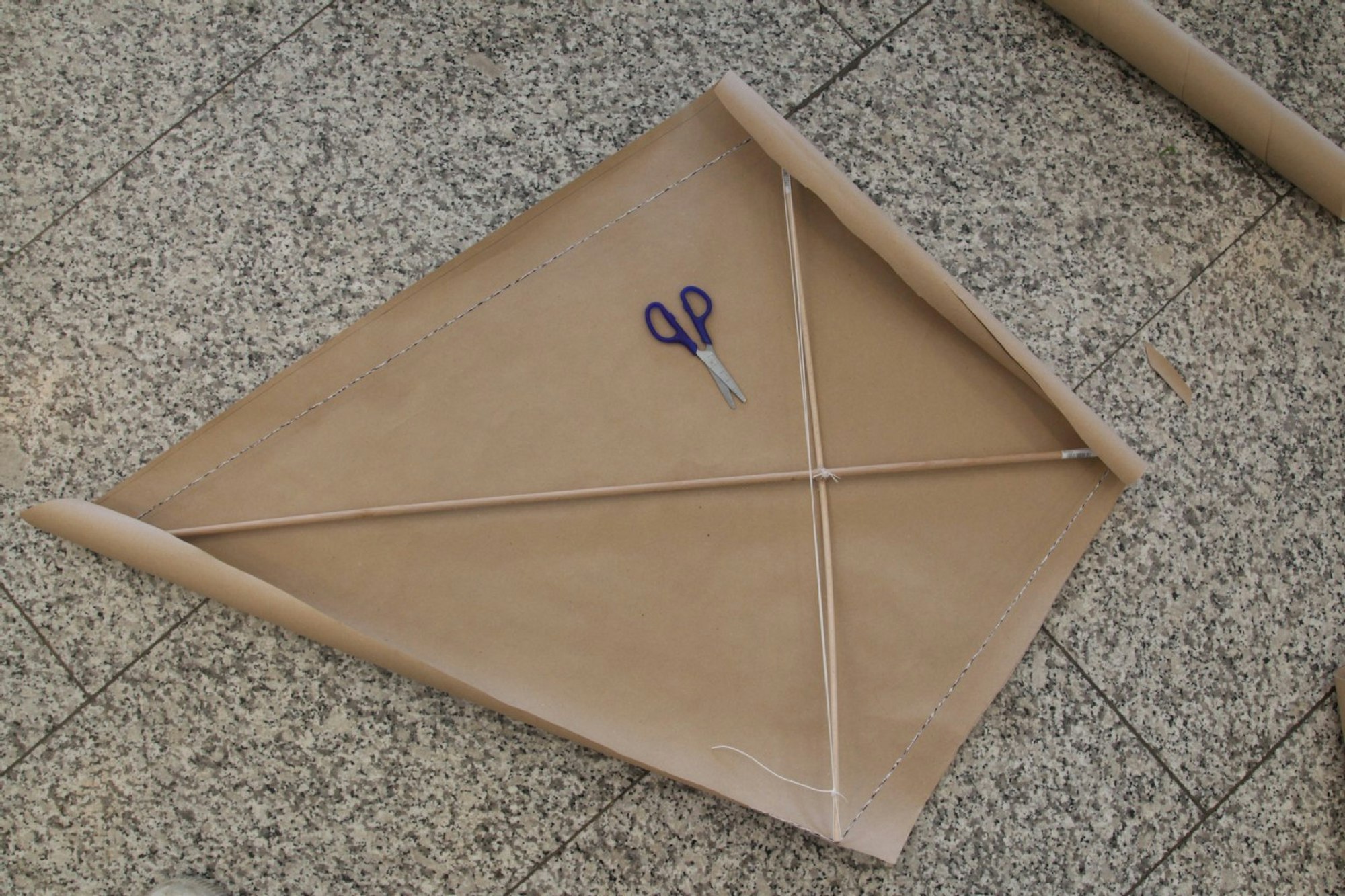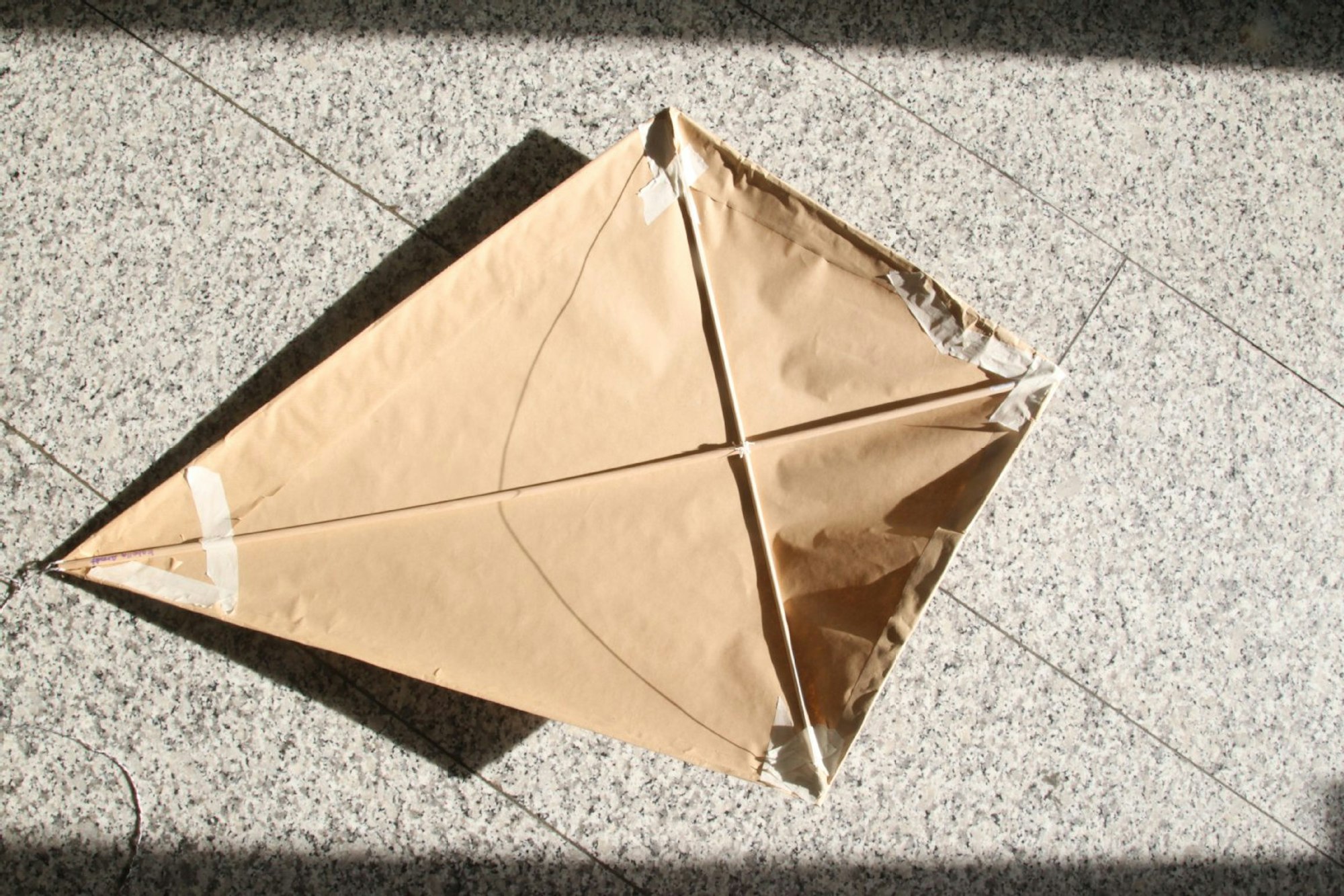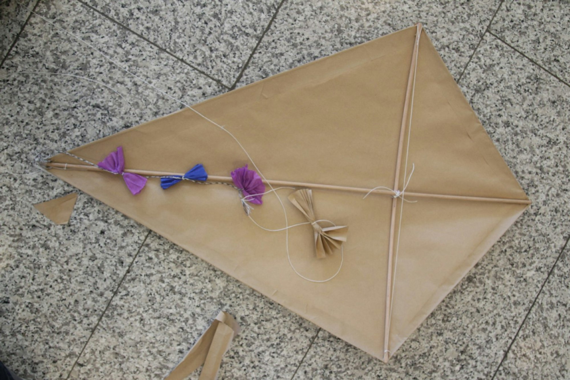 1 Längsstab Buche Dübel 1000mm lang, Ø 8mm1 Querstab Buche Dübel 700 mm lang, Ø 8mmBespannung: Packpapier/Mülltüte 1050mm lang, 800mm breitUmspannung: Schnur 3500mm lang, Ø 1mmTapetenleim/KleberVerstärkungen/KlebestreifenSchere, Säge, Lineal, Bleistift