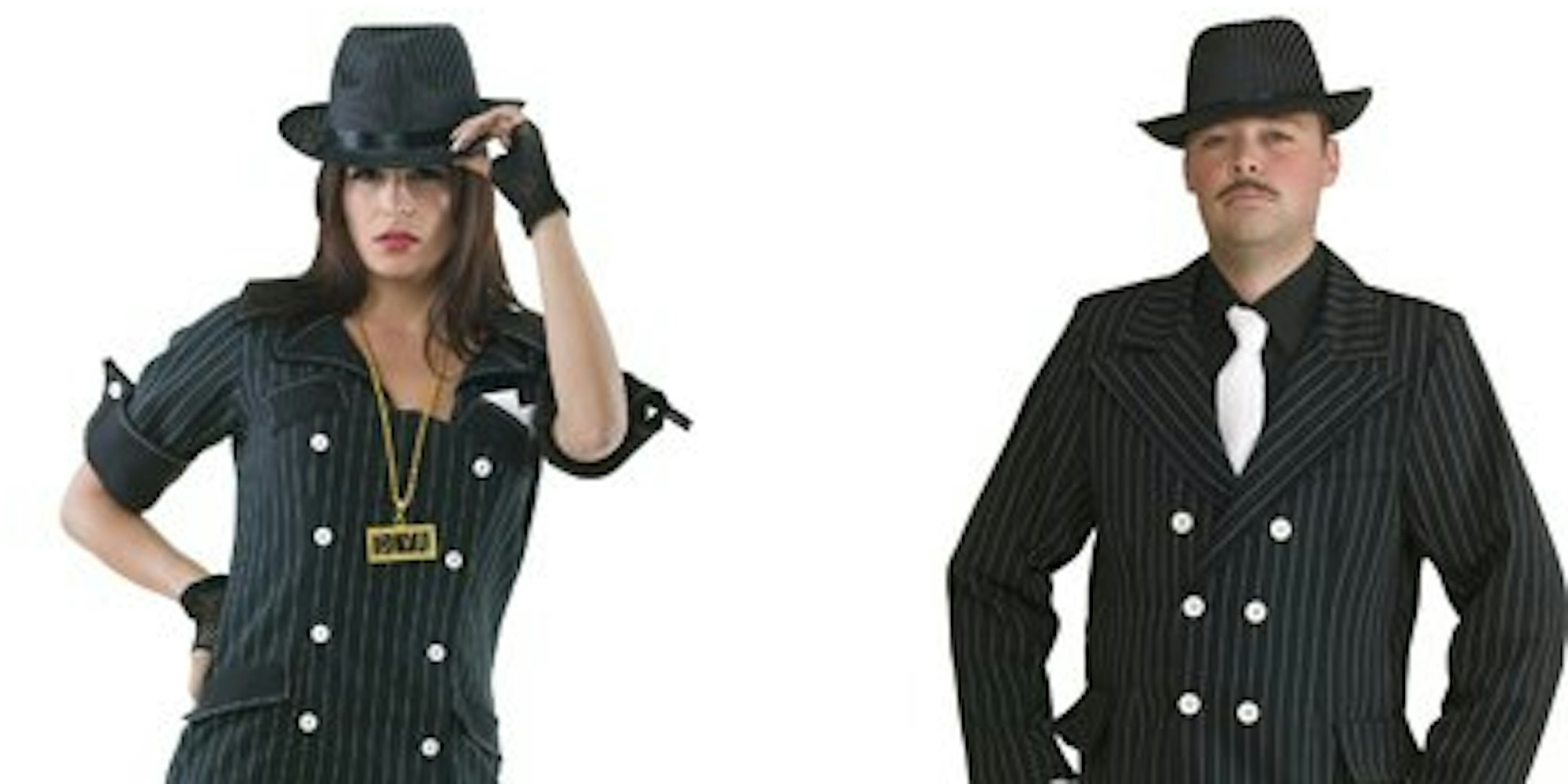 Mit Hose und Jacke mit Nadelstreifen trifft seine Variante genau das klassische Mafia-Image. Im Stil der amerikanischen Gangsterfilme ist die Jacke ihres Kostüms zwar auch gehalten, anstatt der Hose gibt es immerhin einen Hut. Und ein Strumpfband. Wirklich, wofür braucht die Patin von Welt denn eigentlich dieses Strumpfband? (pic)