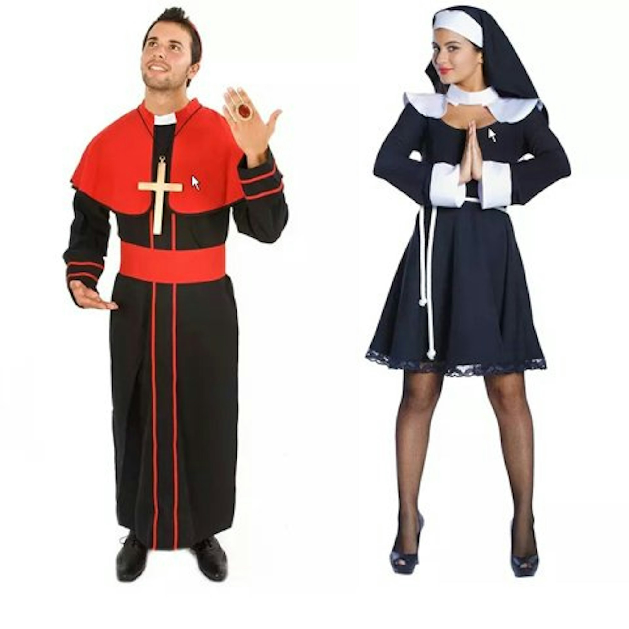 Ein unkompliziertes Kostüm für ihn. Die lange Robe ist schnell über die normalen Klamotten gezogen. Mit frommer Enthaltsamkeit hat ihr Kostüm aber offensichtlich nicht viel zu tun.