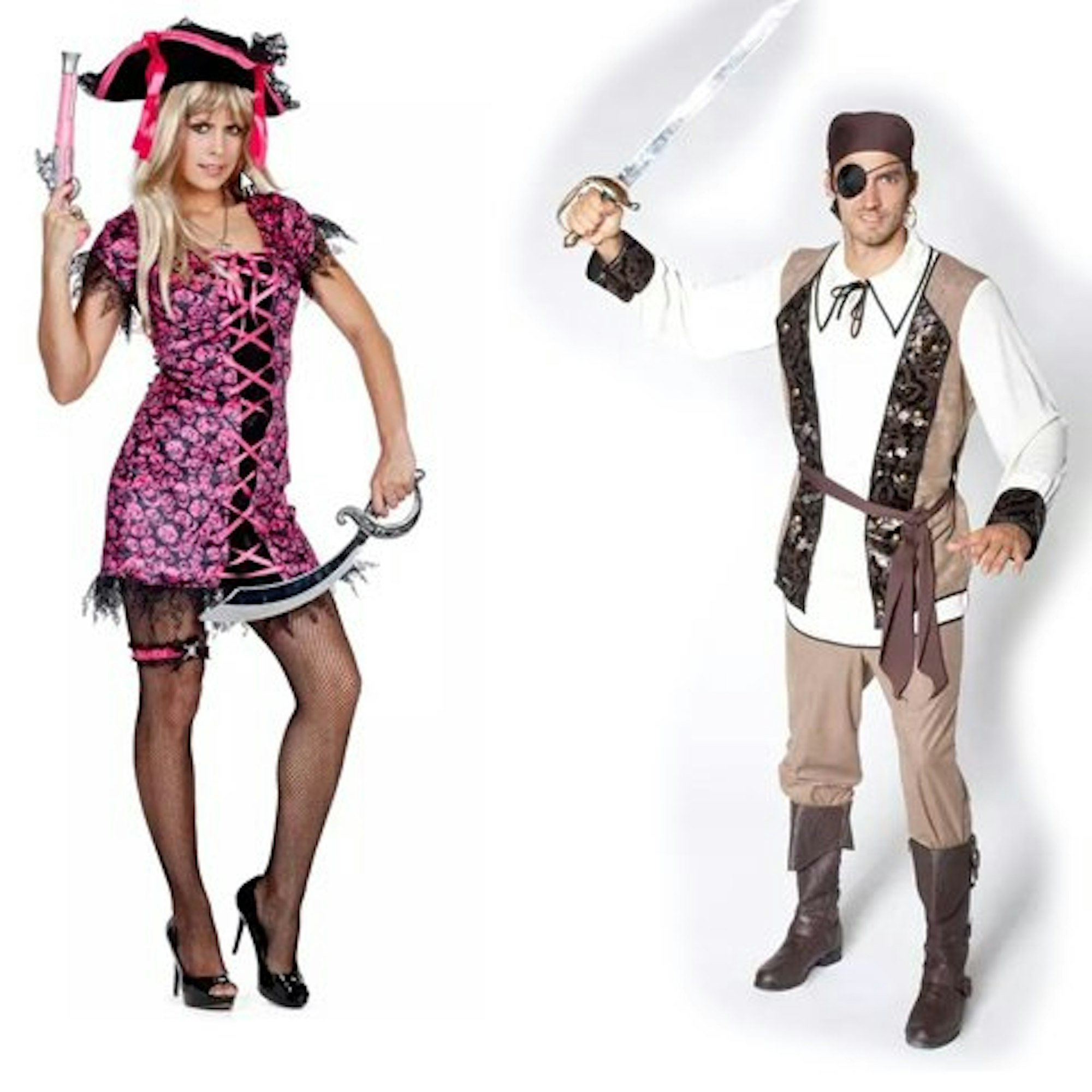 Ein Klassiker unter den Karnevals-Outfits: Mit Hose, Oberteil, Weste, Gürtel, Kopftuch ist die Piratengrundausstattung für ihn komplett. Aber ob ihr Kleid so praktisch beim Kampf auf hoher See gewesen wäre? An die traditionelle Darstellung der Seeräuber erinnert hier fast nur noch der Dreispitz – der dem Kostüm nicht beiliegt.