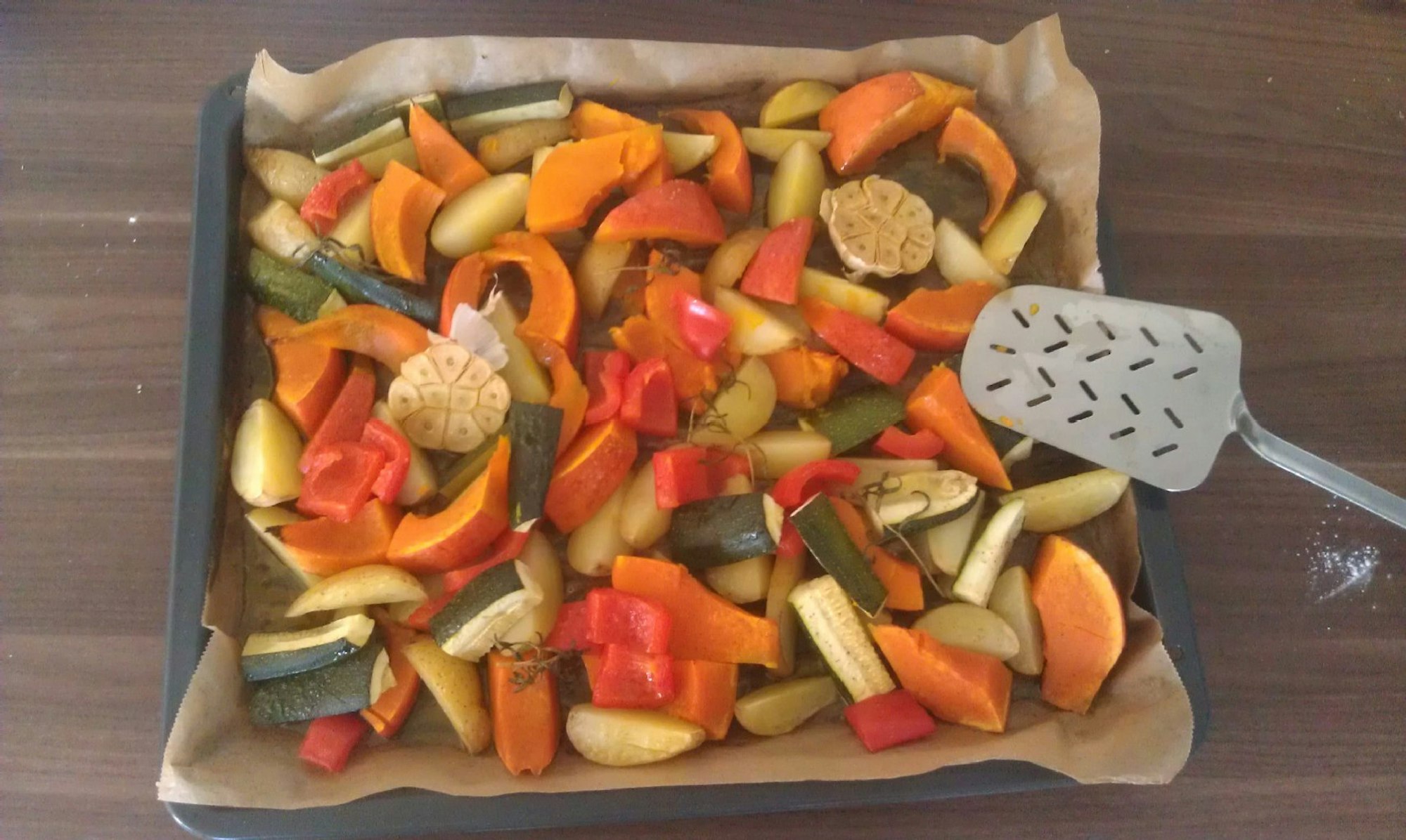 Zutaten für zwei bis drei Personen:1 Zucchini1 Paprika1 kleiner Hokkaidokürbis3 Kartoffeln (gewaschen mit Schale)2 Rosmarin-Zweige1 KnoblauchknolleMeersalz, PfefferOlivenölVariante: zwei Stück Lachs (TK)