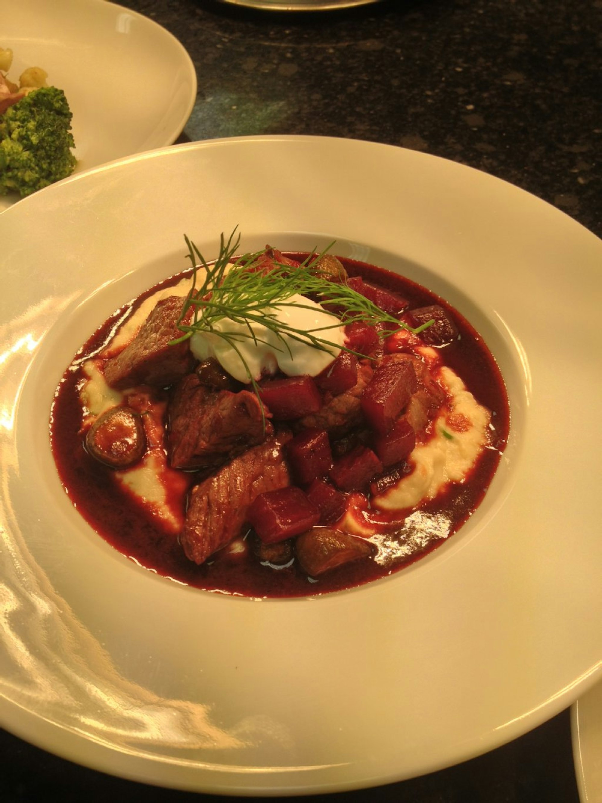 Schon als Kind konnte meine Mutter mich mit Kartoffelbrei und dunkler Bratensauce sehr glücklich machen. Im Laufe meiner kulinarischen Entdeckungsreise gesellte sich die Roulade zu meiner Püree-Saucen-Kombination. Die Säure von Essiggurken und Senf passte hervorragend zu meinem Leibgericht und dann gab es auch noch ein zartes, saftiges Stück Rindfleisch dazu, perfekt. Soweit so gut – bis ich dem erdigen Geschmack der roten Beete begegnete. Mein sensorisches Glück war vollkommen als mir zum ersten Mal Boeuf Stroganoff serviert wurde. Dieser köstliche Klassiker schmeckt an kalten, dunklen Tagen noch besser als sonst schon – natürlich mit einem großen Klecks Crème Fraîche. (Julia Floß)