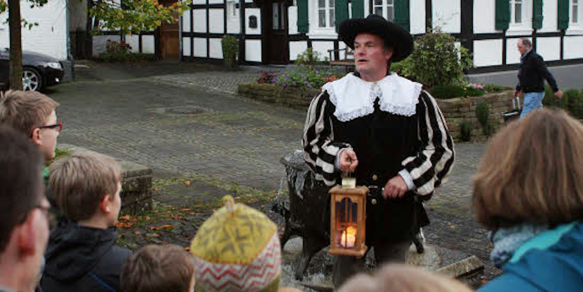 „Hört, Ihr Herrn, und lasst euch sagen, vom Turm die Glock’ hat Sieben geschlagen . . .“, tönt es mit kräftiger Stimme, bevor um die Ecke des mächtigen Turms der Odenthaler St.-Pankratius-Kirche ein Mann mit hell leuchtender Laterne herumgeschritten kommt. Prüfend hält der mit historischem Wamst, Stiefeln und Hut Bekleidete sein Licht in die Höhe, mustert die Gruppe, die sich vor dem Portal der Kirche eingefunden hat. Wäre er jetzt tatsächlich „im Dienst“, würde er sie nach Hause schicken. Schließlich war ein Nachtwächter im Mittelalter so etwas wie der städtische Sicherheitsdienst, der des Nachts für Ruhe, Sicherheit und Ordnung sorgte. Doch das Mittelalter ist lange vorbei, das beschauliche Örtchen Odenthal im Bergischen Land hat nie Stadtrechte besessen und der Mann mit der Laterne ist eigentlich Historiker, Touristiker und Gästeführer.