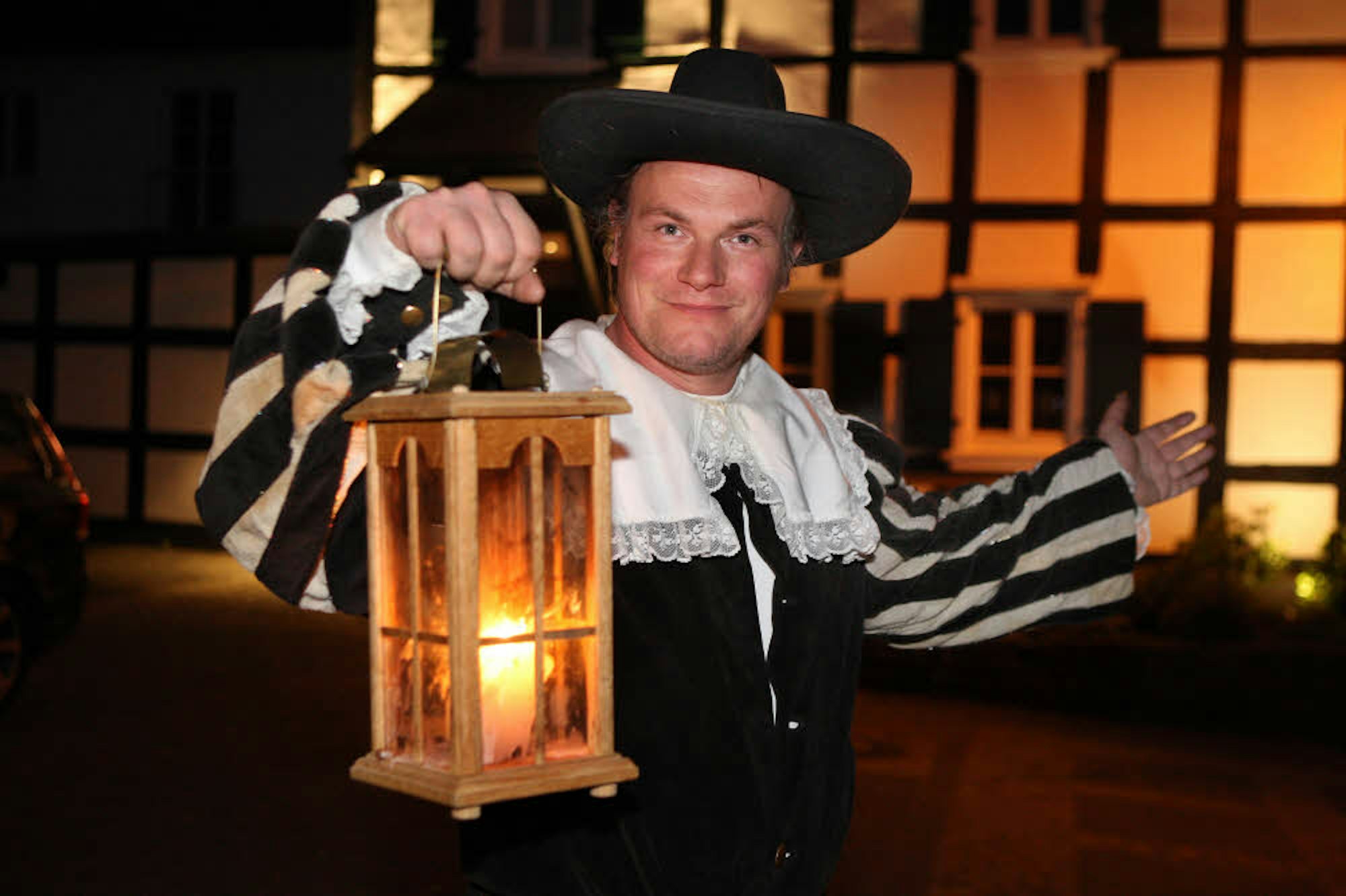 Regelmäßig schlüpft David Bosbach in die Kluft des mittelalterlichen Nachtwächters, um Besucher bei einer abendlichen Tour durch die Straßen von Odenthal auf eine Zeitreise zu entführen.