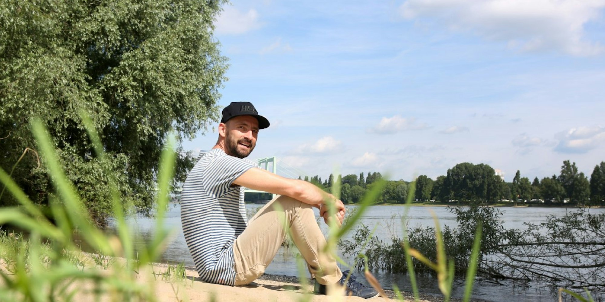Den Gedanken hängt Gentleman nach, als er am Rodenkirchener Strand sitzt. Ein Frachter tuckert stromabwärts vorüber, löst Wellen aus, die sanft über den Kies am Ufer fließen. Das schreckt dennoch die Enten auf, die eben noch geschlafen hatten, sie schnattern. „Guck mal“, bemerkt Gentleman, lacht und schiebt sich die schwarze Schirmmütze aus der Stirn, „jetzt sind sie wach!“