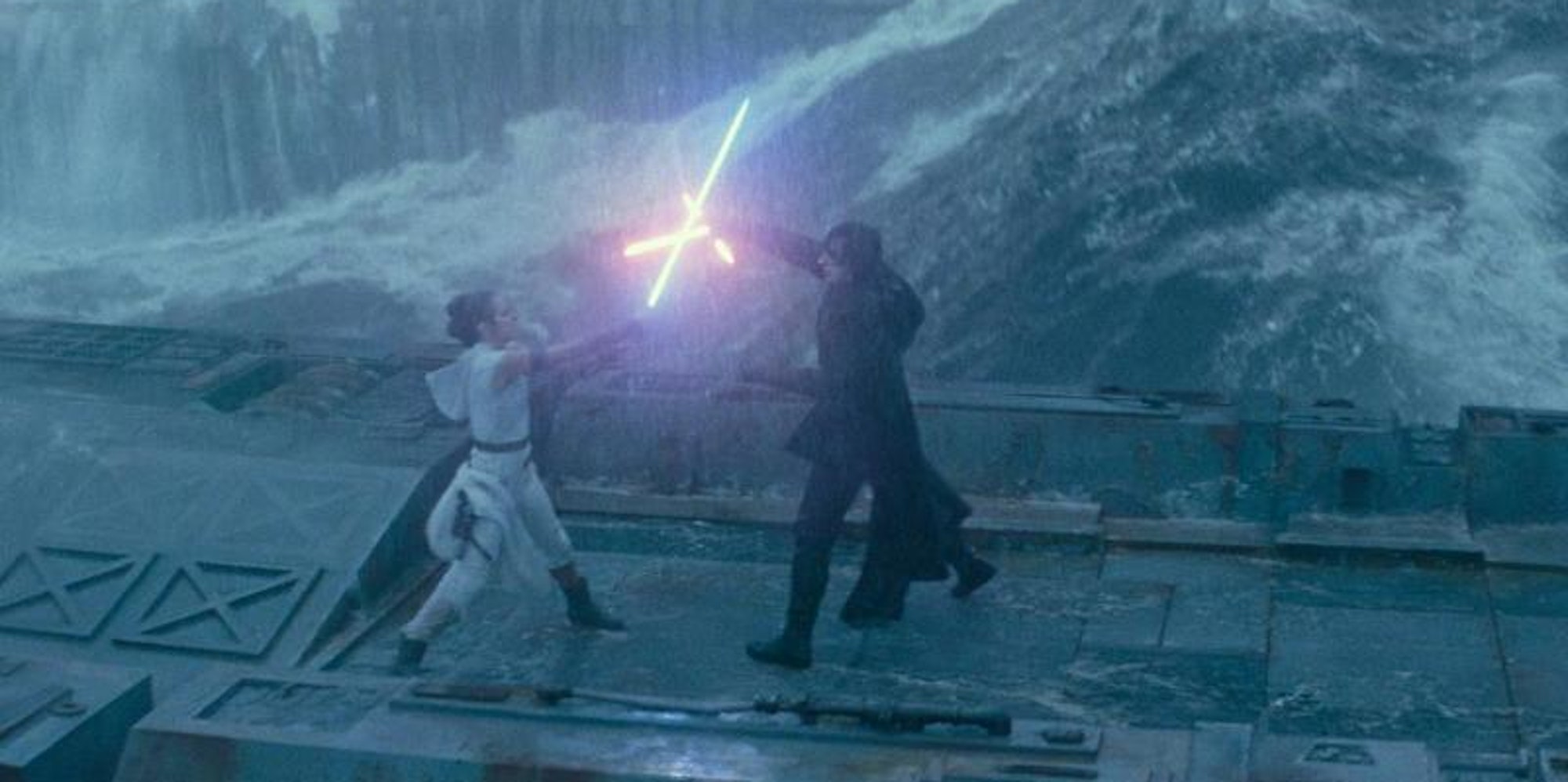 Verkörpert wird der ewige Kampf zwischen der hellen und der dunklen Seite der Macht vom einzigen ernstzunehmenden Paar des Films, Rey und ihr böser Widerpart Kylo Ren (Adam Driver, der sich als Einziger schauspielerisch gegen Alien-Kinder und rotierende Roboter durchsetzen kann).Einmal bilden Rey und Ren mit ihren Körpern kurz ein Yin-und-Yang-Zeichen. Da erscheinen, nur für einen Moment, Gut und Böse, Kommerz und Religion, Filmemachen und Franchisepflege als eine Frage der Perspektive, als zwei Seiten derselben Medaille.