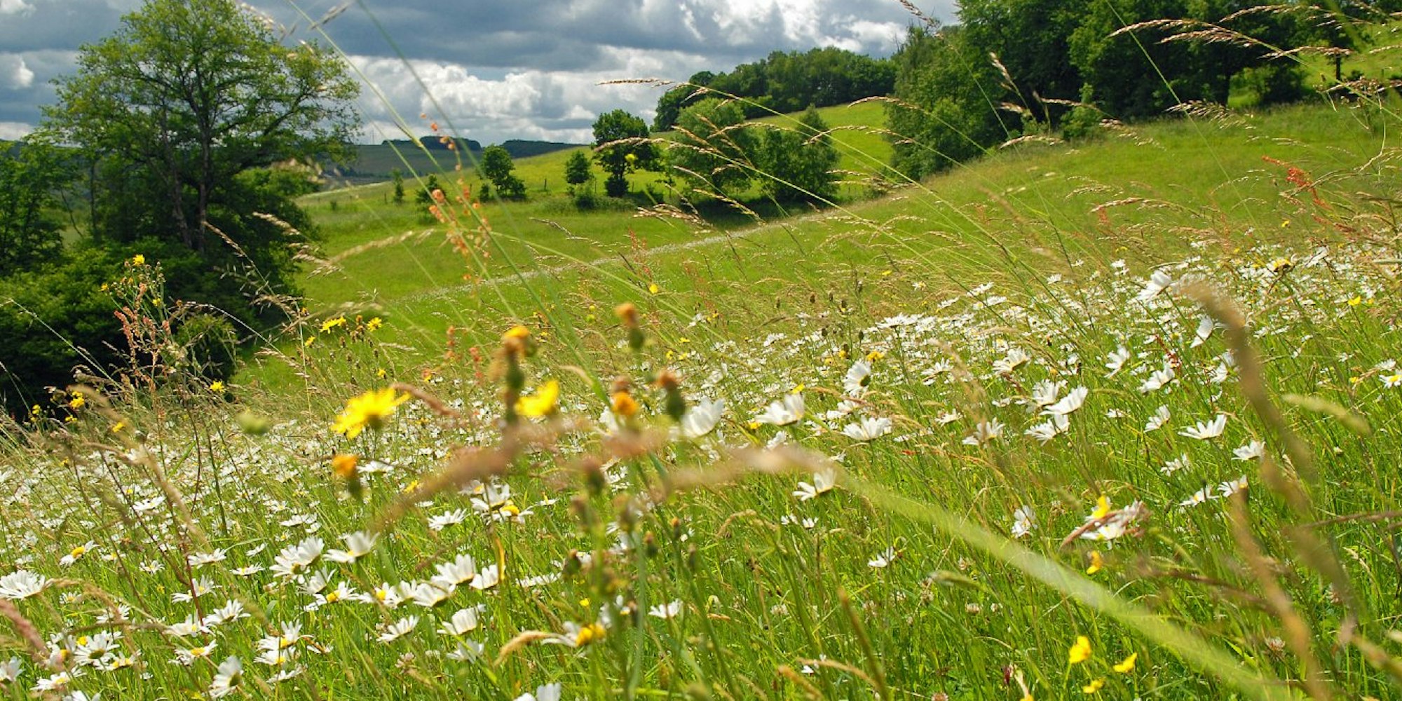 Gut einen Viertelkilometer abermals ein Wegedreieck neben einer Bank: Hier geht es rechts über den Bach hinweg und gleich im Weideland hinauf, im sachten Schwenk nach links. An einer Baumreihe entdecken wir an einer Eiche abermals den Kreis. Dann stoßen wir auf einen asphaltierten Fahrweg in einer engen Kehren und steigen mit dem Zeichen rechts hinauf. Bald schwenkt der Weg nach rechts und bringt uns in der Böschung aufwärts. Dort stoßen wir auf einen Querweg, der zur Linken nicht befestigt ist: Rechts liegt Kocherscheid, wir gehen links und folgen weiterhin dem Kreis. So kommen wir hoch in der Wiesenlandschaft aus dem Tal des Kocherscheider Bachs ins Tal des Irsenbachs, der hier den Grenzverlauf zu Rheinland-Pfalz markiert.