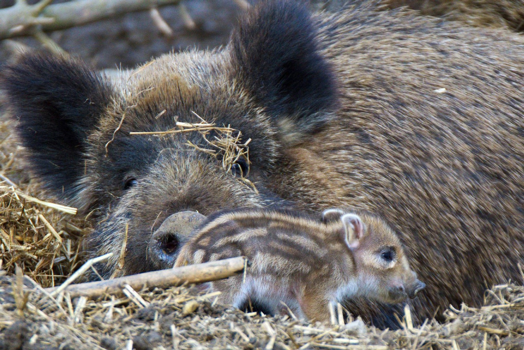 Ein kleines Wildschwein, auch Frischling genannt, mit seiner Mutter.