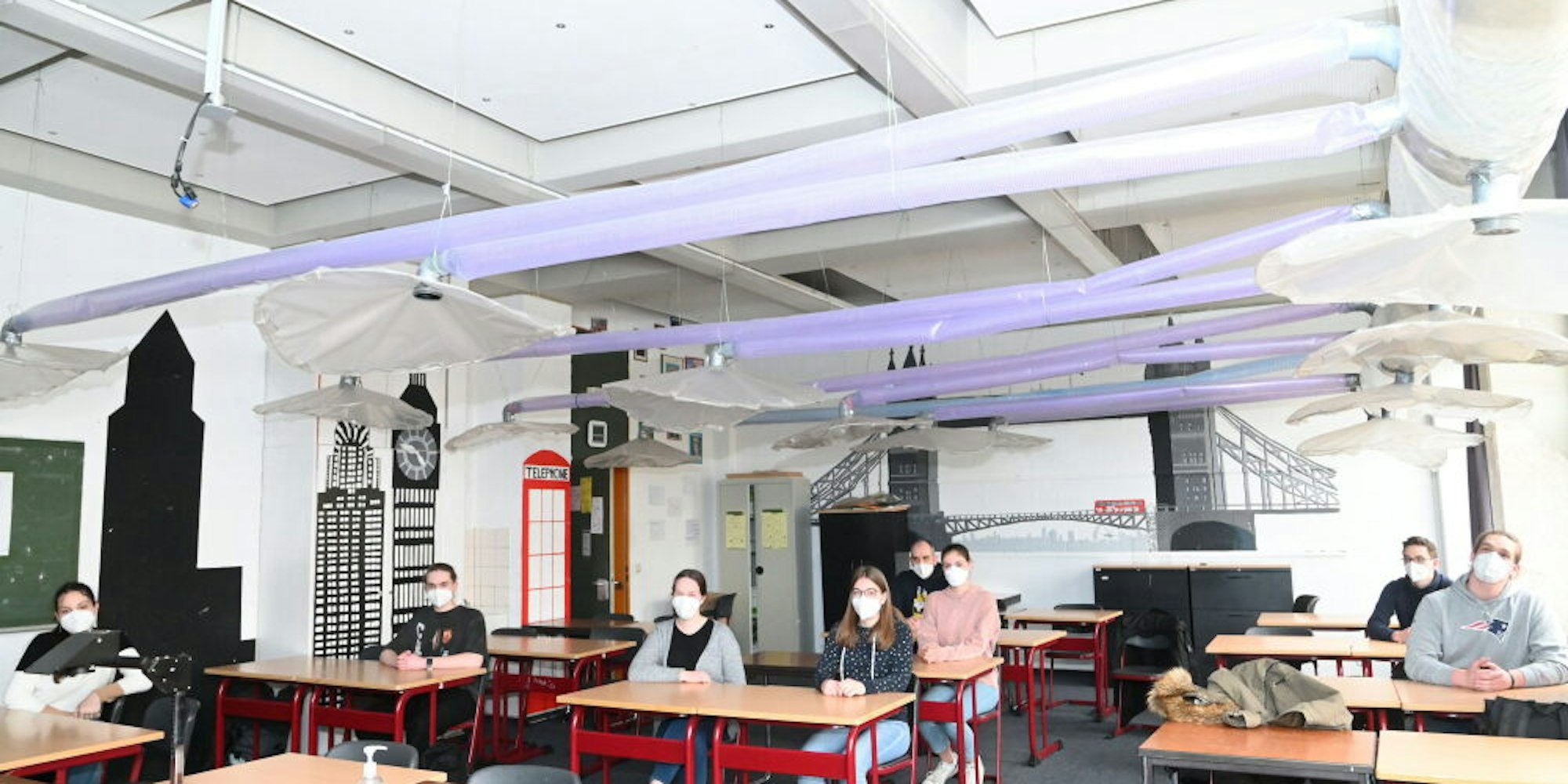 Über den Schülerpulten hängen die schirmähnlicen Gebilde, die die möglicherweise virenbelasteten Aerosole aus der Atemluft absaugen.